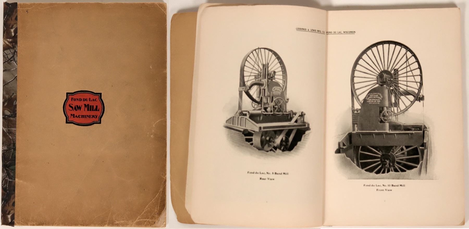 Illustrated Catalogue of Fond Du Lac Saw Mill Machinery Manufactured by Giddings & Lewis Co., Fond Du Lac, Wisconsin. P. B. Haber Printing Co. 7" x 9.5" soft bound publication of 115 pages. Well Illustrated with renderings, diagrams, photographs and tables. Full Index. Binding has been repaired with tape. Excellent turn of the century machinery reference; classic Industrial Revolution research material.