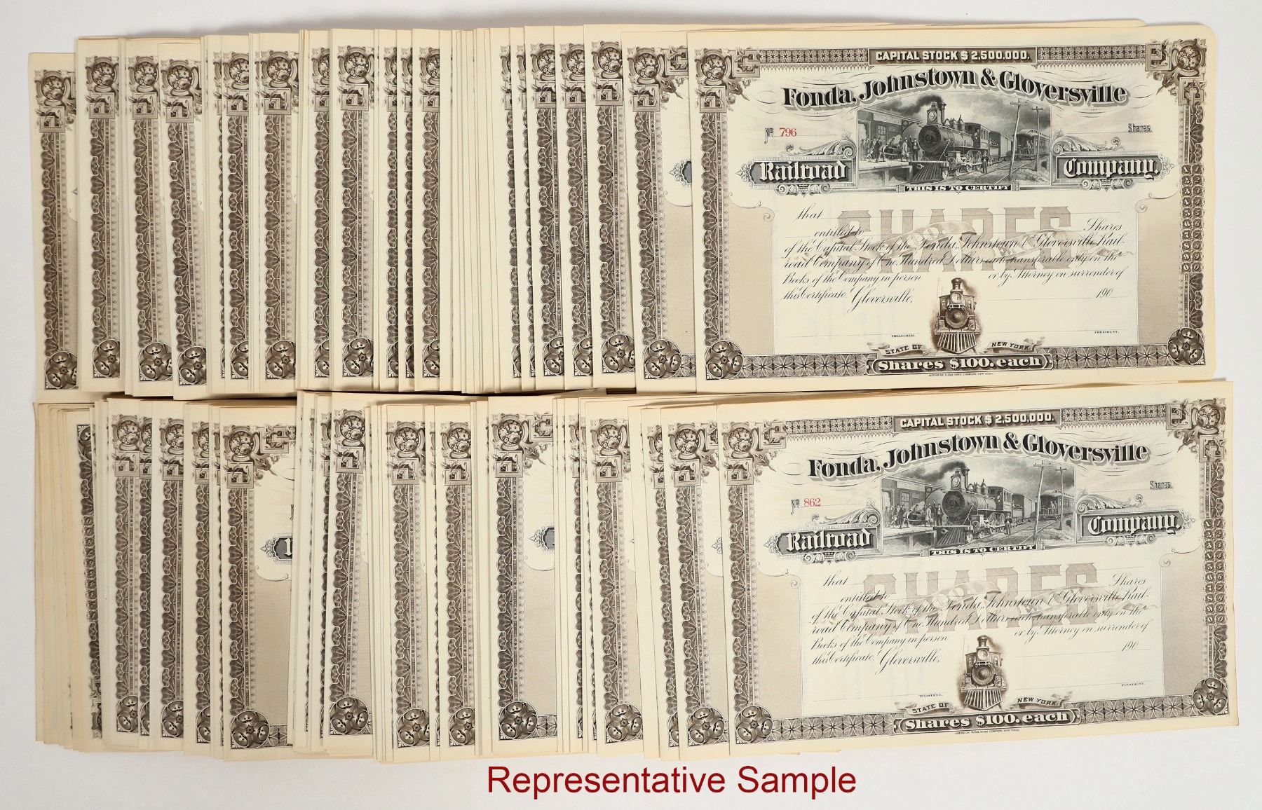 Approx. 100 All unissued. Dateline 19__. EF condition. Fonda, Johnstown & Gloversville Railroad Co. Stocks, with receipts. Great train vignettes. American BNC printer.