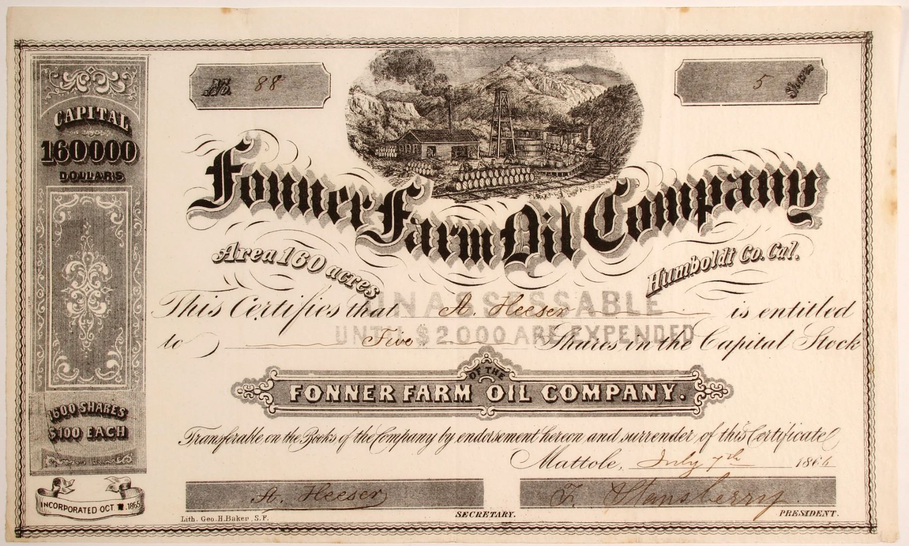 # 88 for 5 shares to H Heeser. Datelined a rare Mattole 1866. Signed by secretary A Heeser and president F Stansbury. Incorporated October 1865. Printed by Geo. H Baker. Uncancelled. Located "160 Acres, Humboldt Co., Cal. At the Fonner Farm Well they keep their drill in motion; and were down, on Thursday, 256 feet. For the present this is the well showing superior indications of oil [Mining and Scientific Press, 1866] State: California City: Mattole District, Humboldt County Date: 1866