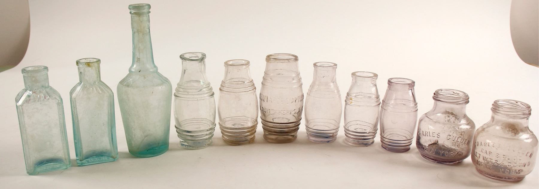 Item # 1 of 11: Figural barrel mustard bottle. French, embossed : Moutarde Diaphane / Louit Freres & Co// Base: Rough, sand pontil. 1860's. Clear , 5" tall, rolled over applied lip. Perfect condition. Item #2 of 11:Pale aqua, figural barrel mustard. 5 1/4" tall, square collar top, tooled lip. Light haze and a 1 4" lip flake. First one i have ever seen with a pour spout !! Very crude specimen. Otherwise good. Items #3 - Item #6: 4 clear , figural barrel mustard bottles. 5 3/4" , 4 1/2", 4 1/8" & 4" tall. All in good condition with some minor haze, except for item #6 which has 2 small lip flakes, 1/ 8" & 1/16" in size. Item # 7 of 11: Charles Gulden ( au )/ Cap 8 Fl OZ / Net WT. 3 12/ OZ. AVD./ New York // Base embossed : Guldens Patent Cap ( au ) / Style No. 6 ( au )/ Mustard ( ad ) // Clear, squat mustard bottle. 4" tall , ABM lip. Perfect condition. Item #8 of 11: Same bottle, but different embossing: Charles Gulden ( au ) / ( No capacities embossed ) New York // base: same embossing. // Perfect condition. Item # 9 of 11: Aqua, fancy ketchup style bottle. 8 1/4" tall, double collar top, tooled lip. Fluted neck, faceted shoulder , and tapered body. // Base embossed : D.O.C. // Dug condition, frosty appearance with haze, but no damage. Items # 10 & #11 of 11 : Identical specimens : H. J . Heinz Co.//f // Pitts burg U.S.A.//f// Bases embossed : H 17// Aqua , sauce type bottles. 5 3/8" & 5 1/4" tall. Dug specimens, with stain and haze. One has a base pin head, other wise no damage. Very nice collection of food bottles, for the kitchen window sill. Get them and watch them chance color, to sun colored amethyst. !! ( RH ). Geff Pollock Collection