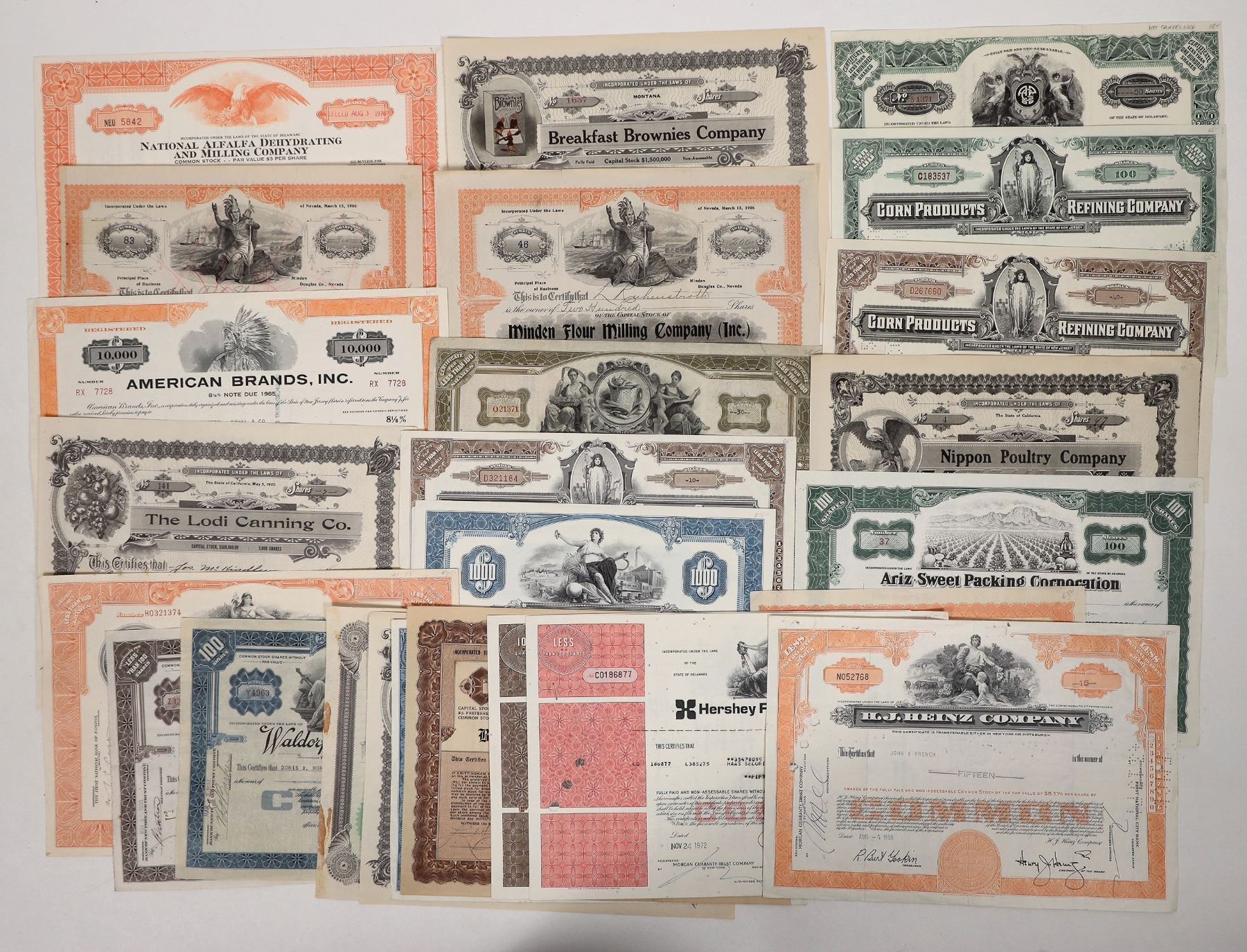 A collection of 25 stock certificates from a variety of American companies involved in food production and distribution, dating from 1908 to 1977. The collection includes stocks from canning and packing companies, grain companies, candy companies, meat companies, baked goods companies, and more. Majority of certificates are issued with a few unissued. A handful are cancelled. Varying condition; some certs have some toning, tearing around edges.