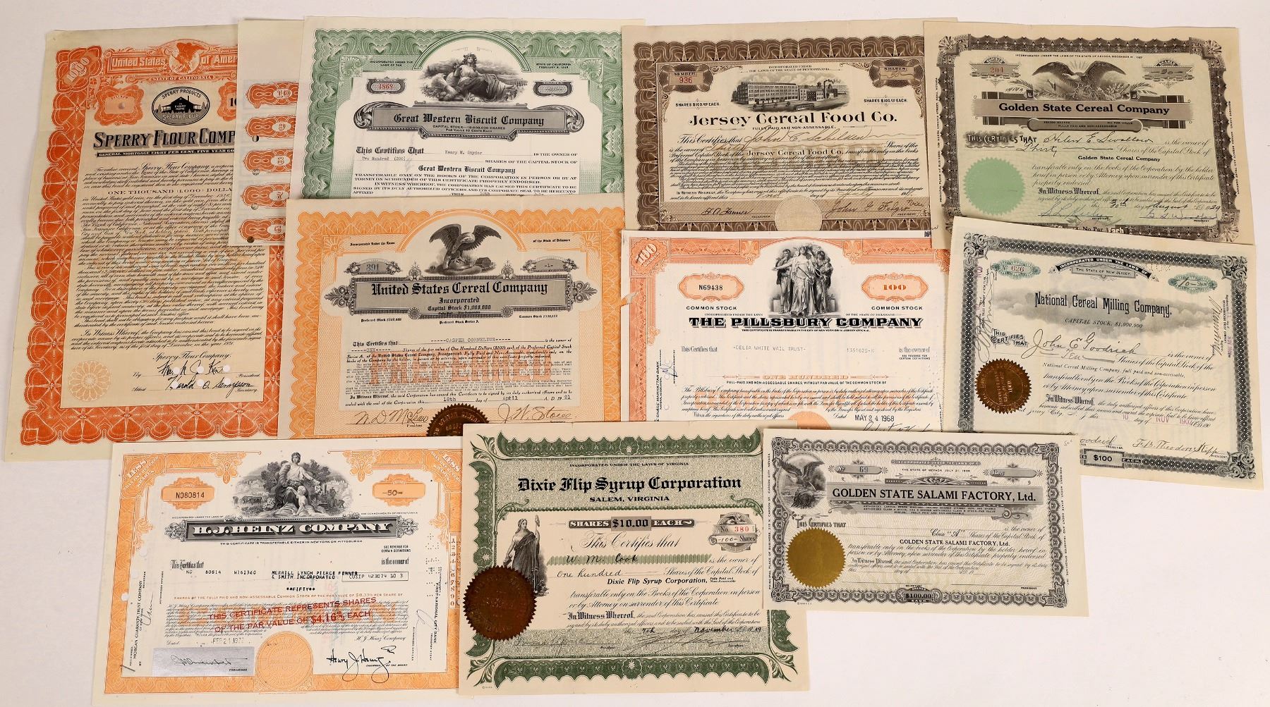 Lot of 10 different. Included: HJ Heinz Co. (1972); Dixie Flip Syrup Corp. (1919); Pillsbury Co. (1968); Golden State Cereal Co. (1929); Jersey Cereal Food Co. (1919); National Cereal Milling Co. (1902); United States Cereal Co. (1921); Great Western Biscuit Co. (1946); Golden State Salami Factory, Ltd. (uniss.); and Sperry Flour Co. ($1,000 bond, 1921).