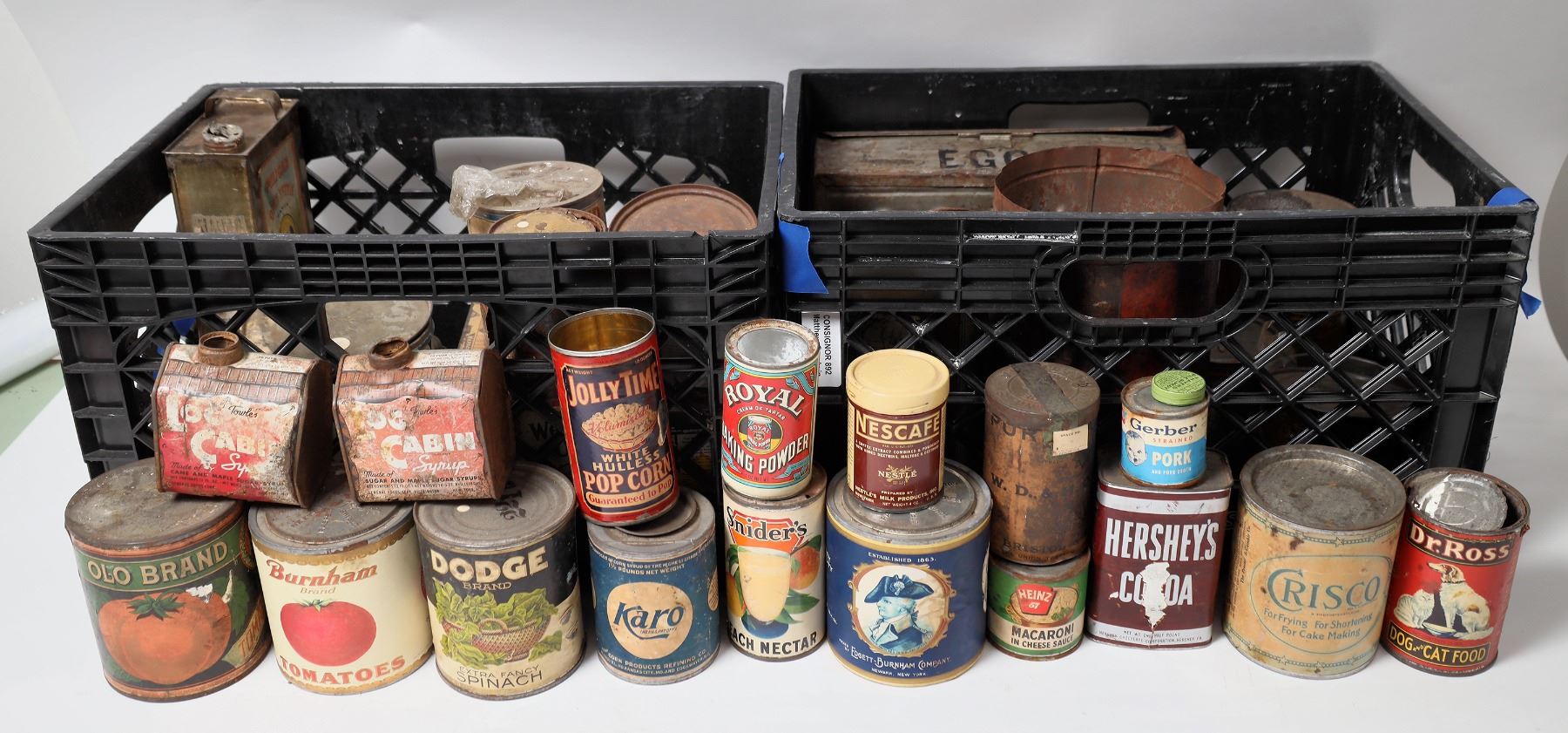 About 30 food tins. Inland Tomato Puree, several Log Cabin Syrup, Wayne Spinach, Karo Syrup, Dodge Spinach, Jolly Time Popcorn, Pelican Molasses, Snowdrift Shortening, Crisco Burham Tomato etc. From The Chilcott General Store Collection.