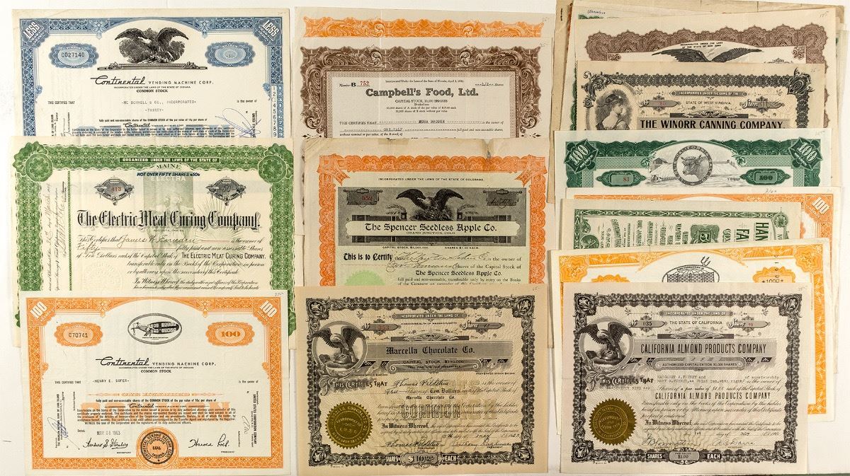 Lot of twenty. Includes: Mate Corp. of America (1922, not cxl), Cornstalk Products Co. (1930, not cxl), Thompson's Malted Food Co. (1917, not cxl), The Nestle-Lemur Co. (1930, stamp and punch cxl), Dennos Food Co. of Portland (1913, not cxl), W.P. Chase Candy Corp. (1924, not cxl), Sun-Life Brands (1937, not cxl), The Winorr Canning Co. (1900, pen cxl), Maccella Chocolate Co. (1923, not cxl), Marine Protein Corp. (1976), The Electric Meat Curing Co. (1909, not cxl), Hanover Farms ($500 bond, 1913, not cxl), The Spencer Seedless Apple Co. (Grand Junction, 1905, not cxl), Campbell's Food (two 1931, not cxl), California Almond Products Co. (1940, not cxl), Leslie-California Salt Co. (1928, cxl), and Continental Vending Machine Corp. (1961, 1962, 1963). (Prag Collection) City: State: United States Date: 1900-1976 hwac# 34375