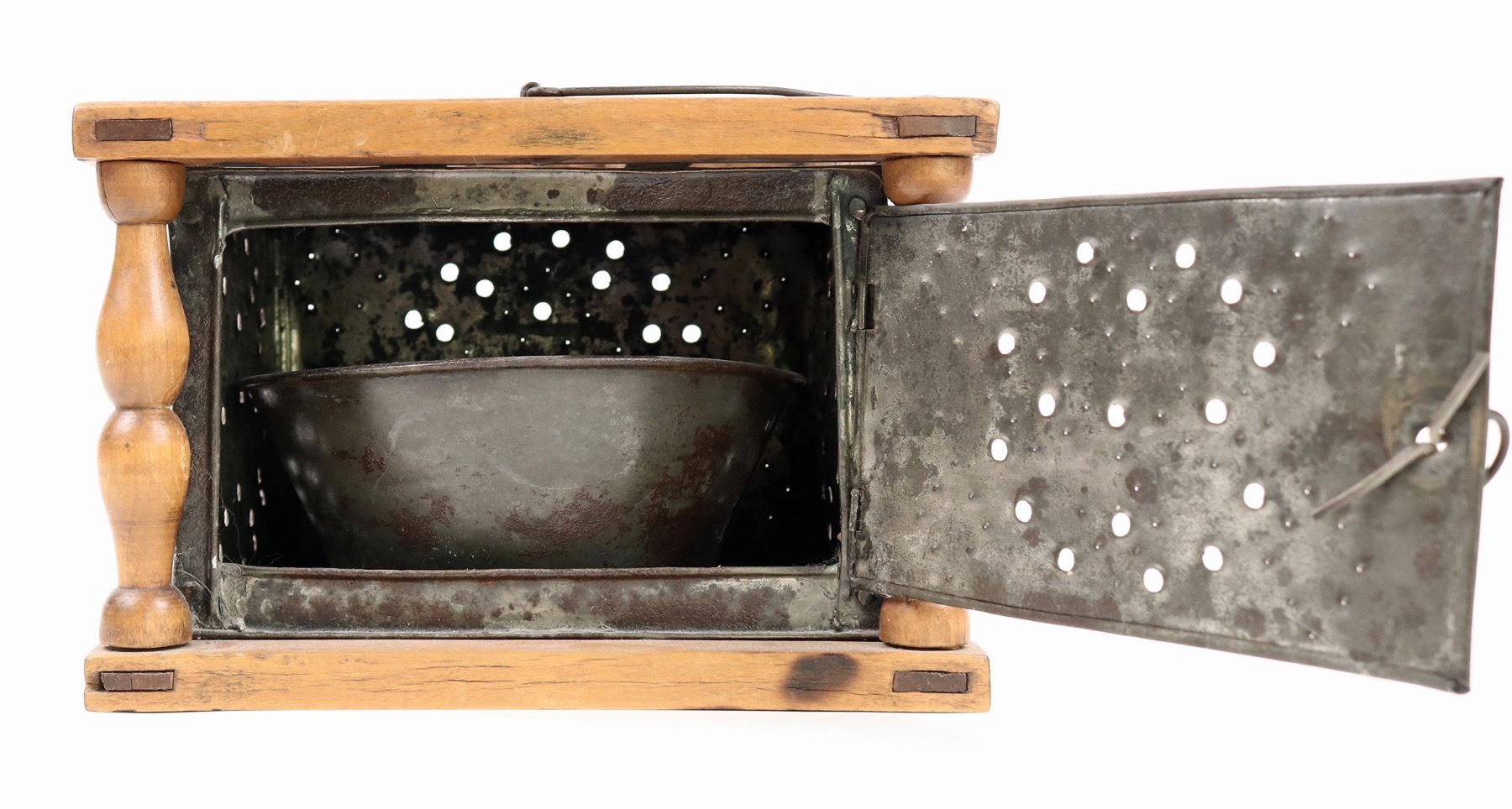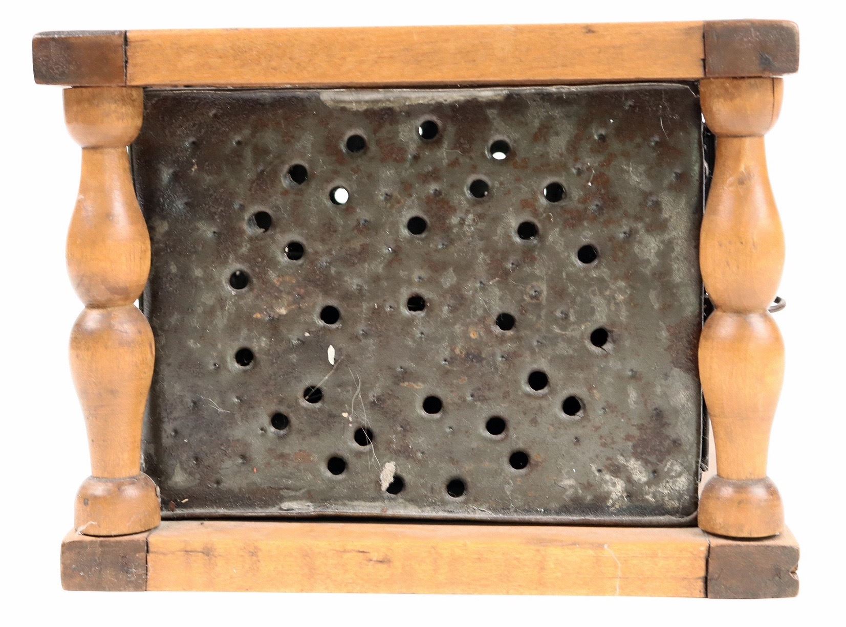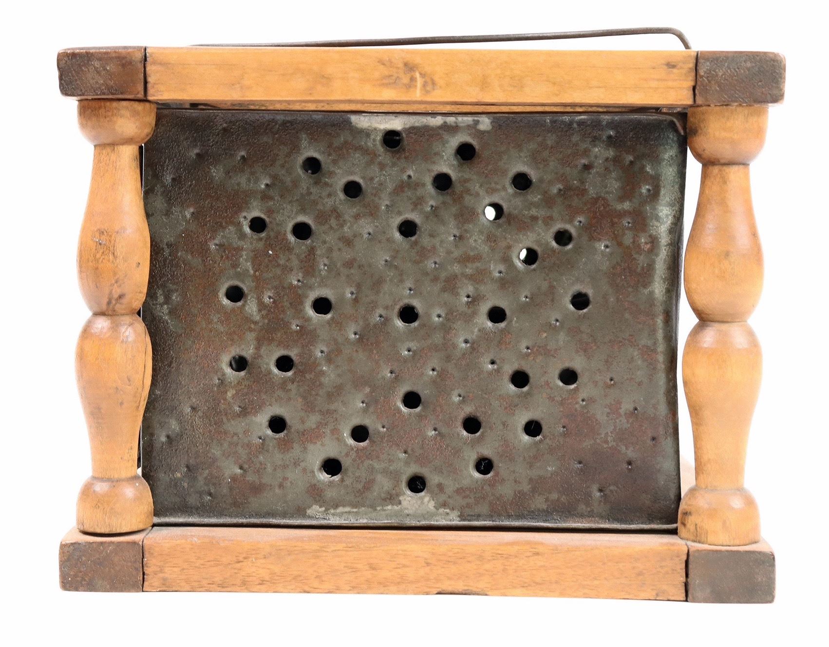 19th century wood and metal cage style foot warmer with internal ember cup with a small hole. 5.5x8.5x7.5". Nice overall condition[