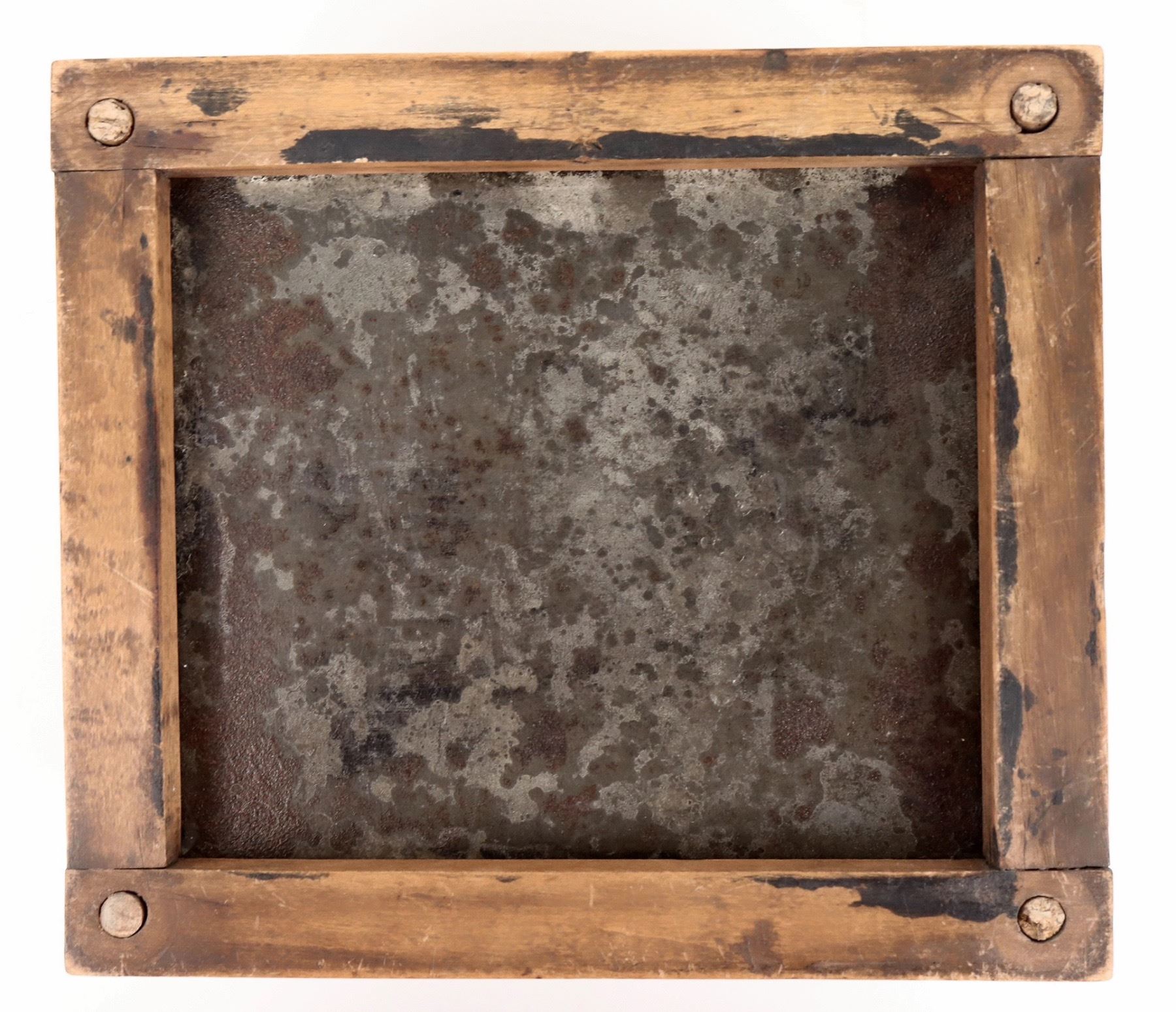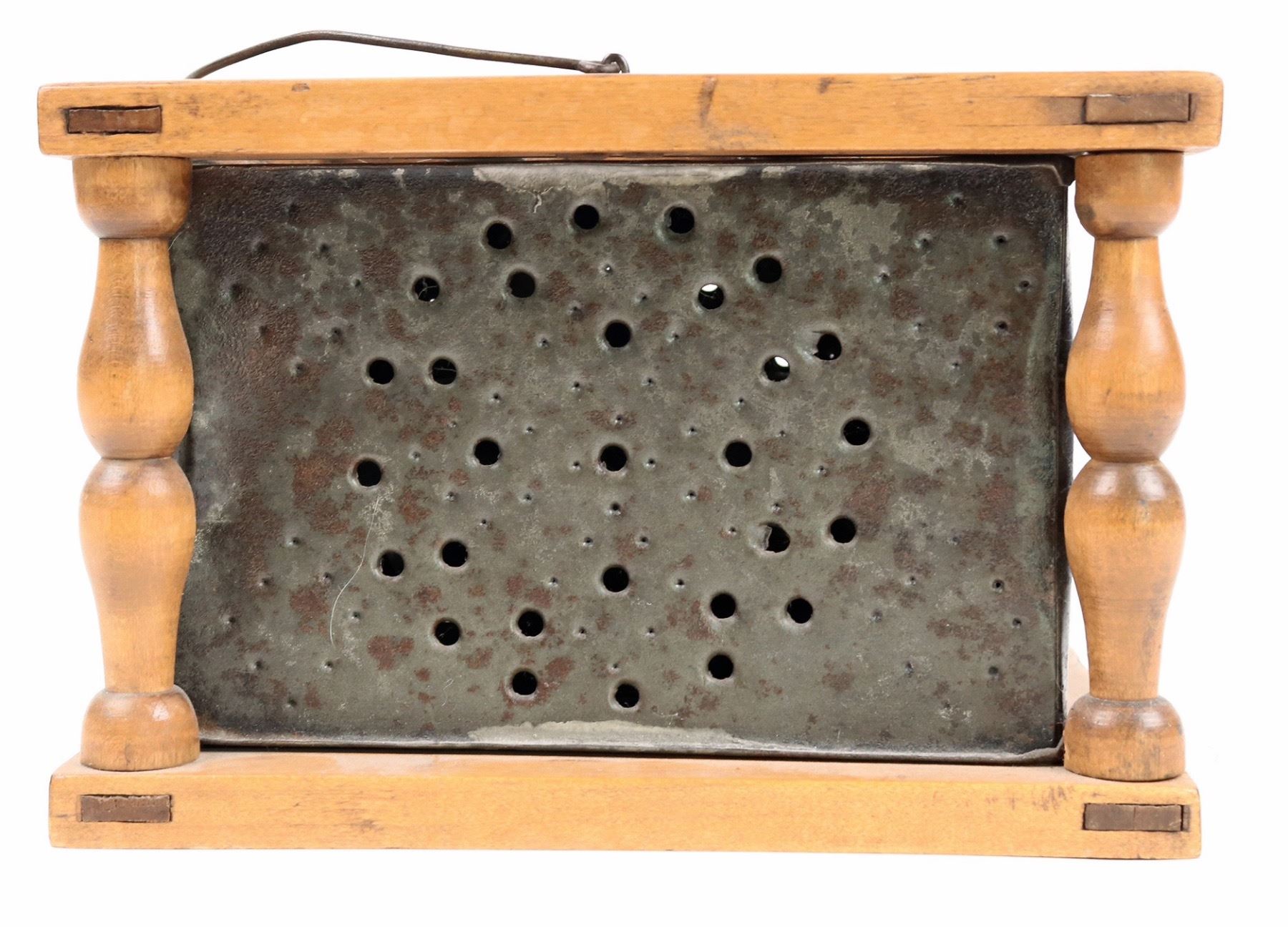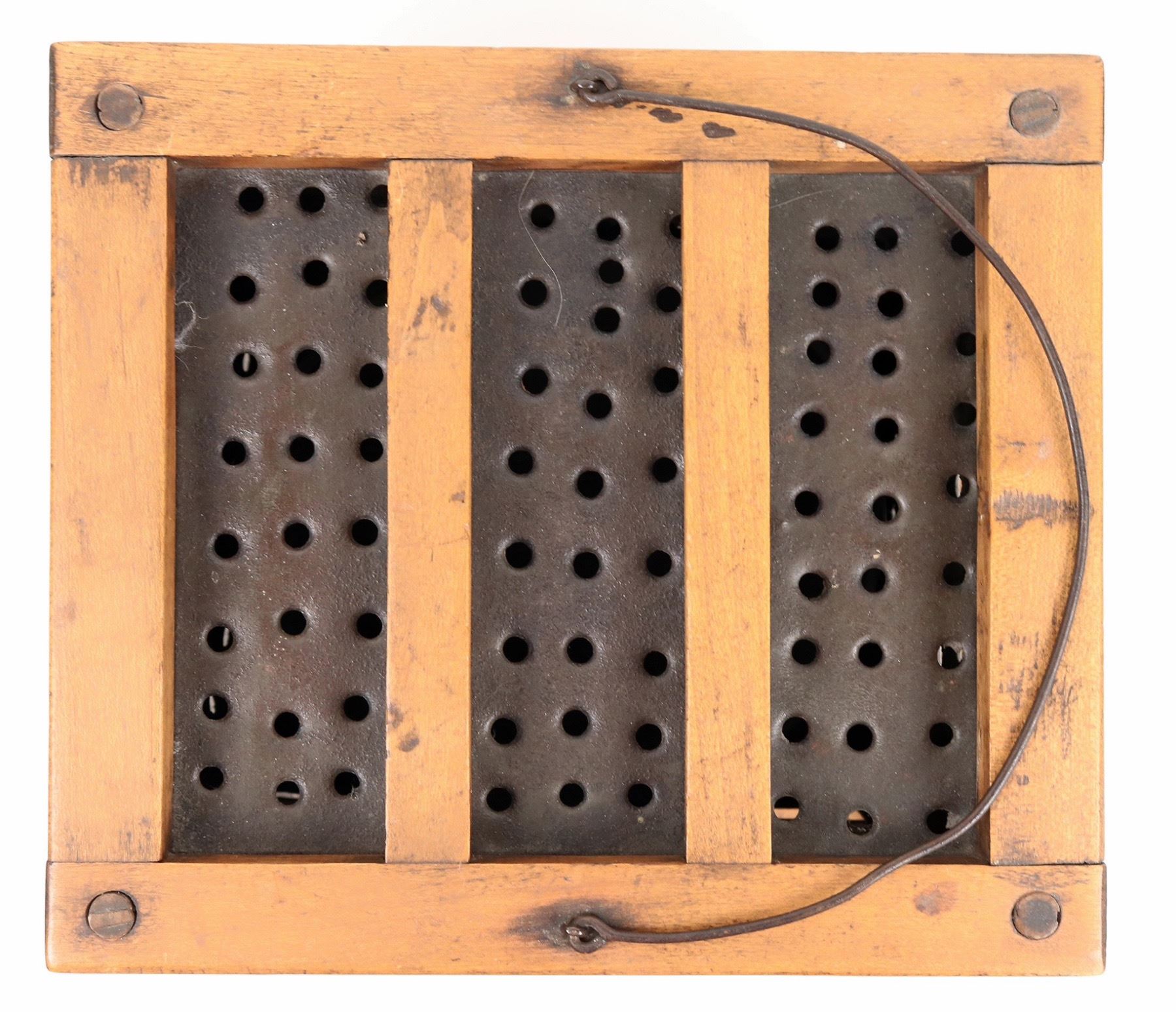 19th century wood and metal cage style foot warmer with internal ember cup with a small hole. 5.5x8.5x7.5". Nice overall condition[