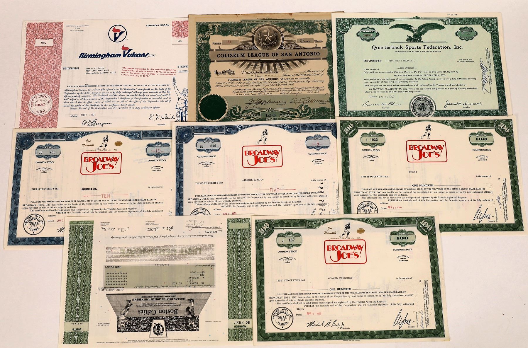 Lot of seven football related stock certificates: 1969 Broadway Joe's (4) Joe Namath's restaurant; Quarterback Sports Federation, Inc. 1969; Coliseum League of San Antonio, 1913; Birmingham Vulcans, 1975. One Boston Celtics certificate, 1999.
