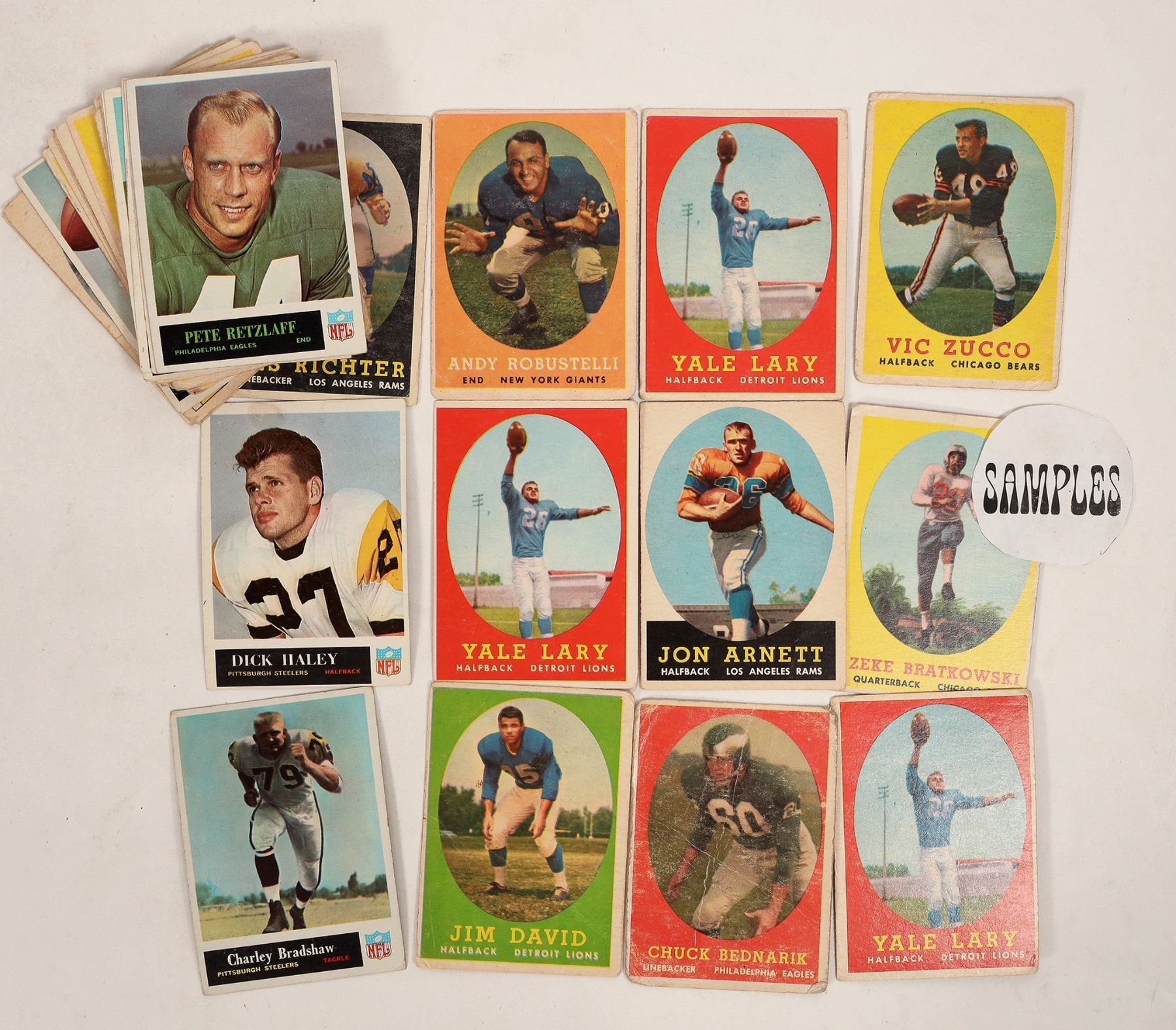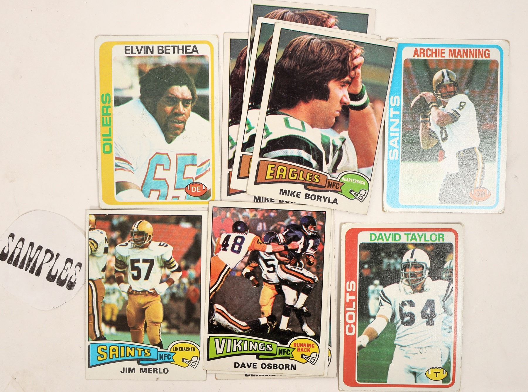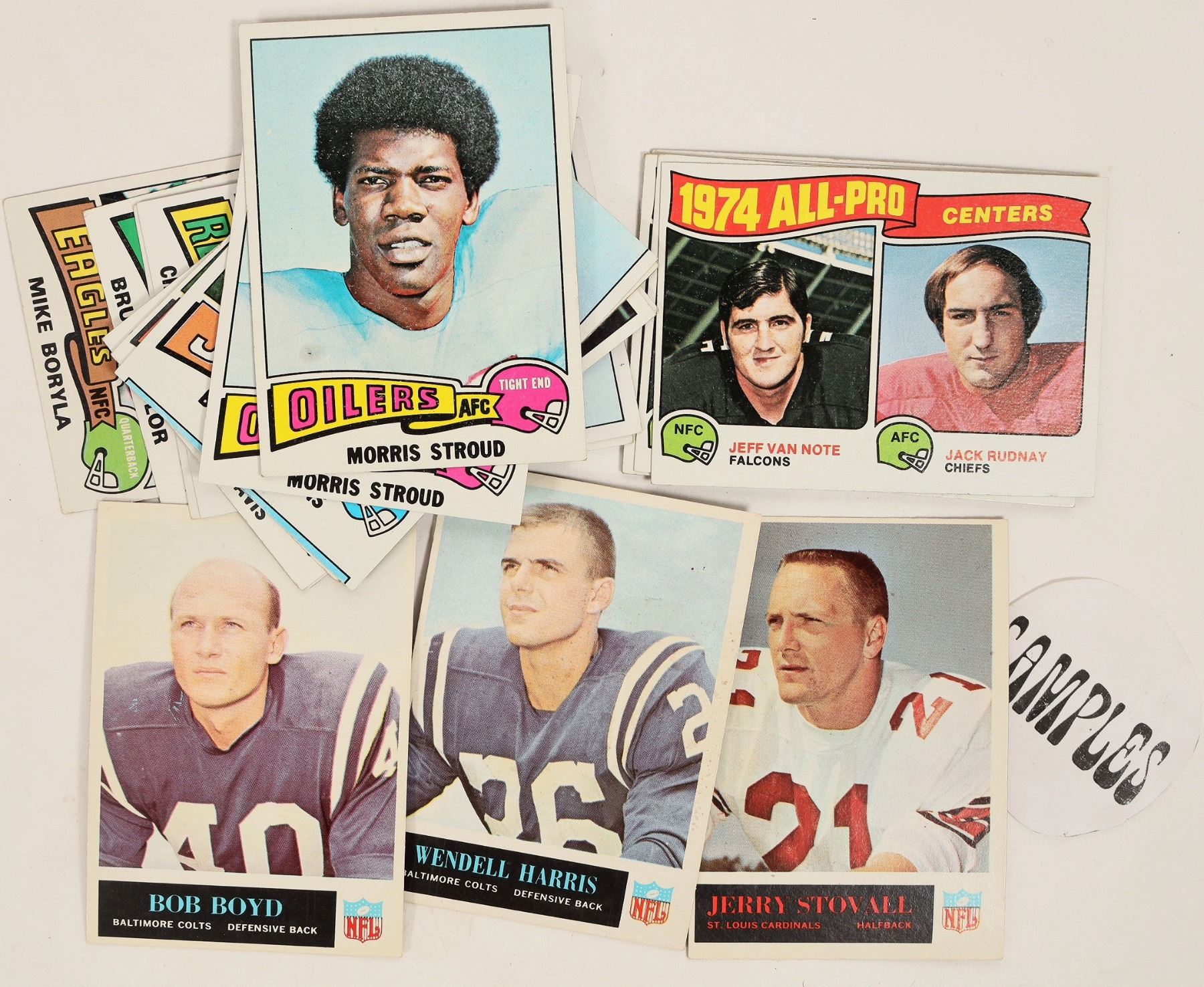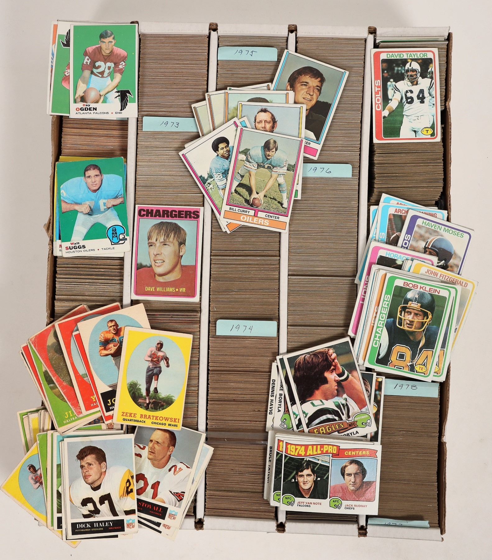 About 2000 football cards, 1971-78, some may be older. Includes Hall of Famers and stars, Terry Bradshaw, Earl Morrall, Lyle Alzado, Lawrence McCutcheon, Carl Eller, O J Simpson, Garo Yepremian, John Matuszak, Mercury Morris and more. Some dupes.