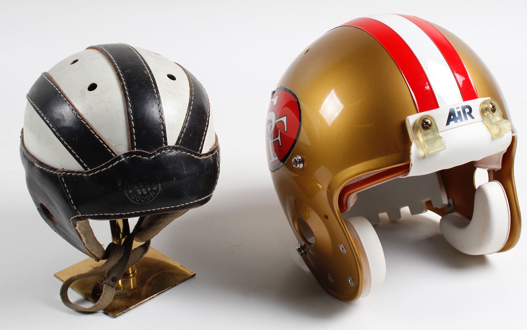Two sports helmets, football. San Francisco 49ers modern day helmet in mint condition. The second hat is a very early leather football helmet in black and white circa 1930s to 40s. Hamilton Hat Collection. Date: Location: HWAC# 64463