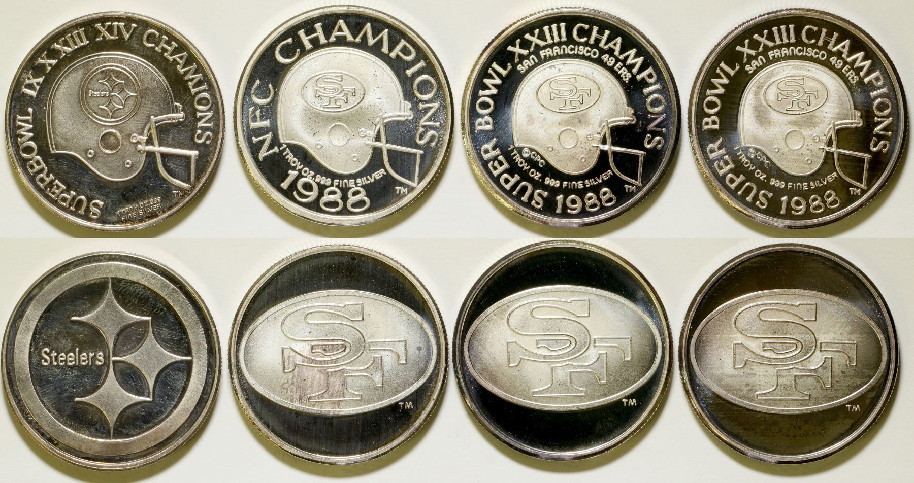 Lot of four, all one troy ounce, 0.999 fine silver: two 1988 Super Bowl XXIII Champions S.F. 49ers; one 1988 NFC Champions S.F. 49ers; one Steelers, Super Bowl IX, X, XIII, XIV Champions.Salvatore Falcone Collection