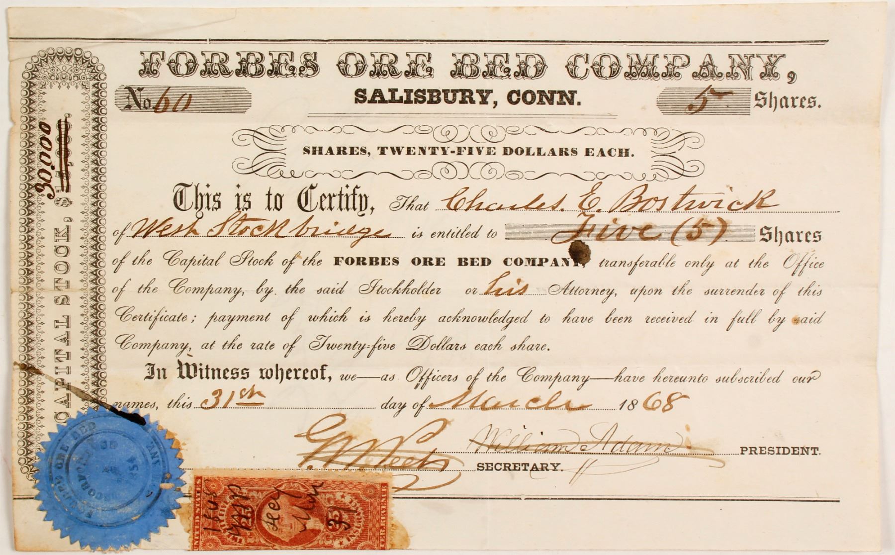 # 60 for 5 shares to Charles E Bostwick of West Stockbridge. Signed by WIlliam Adams president. Pen Cancelled. Dateline 1868. Incorporated 1854. 25c Insurance Revenue Stamp which is trimmed. Blue seal. Black ink stain on bottom left and middle center. Clue marks by stamp. Good Condition. "The Davis Ore Bed named after an early owner was originally called Hendricks Ore Bed and was owned before the organization of the town of Salisbury by Thomas Lamb one of the first settlers in the town. Ore was mined in this bed as early as 1730 or 1731 and was taken by Lamb to supply his forge at Lime Rock. It was in early days transported in leathern bags on horses. This mine has been worked almost constantly since first opened showing an increased production. The average yearly yield at present is estimated to be about 15,000 tons. The property has passed through several ownerships the proprietors are now incorporated under the name of Forbes Ore Bed Company." [Transactions of the American Institute of Mining Engineers, 1878] Prag Collection
