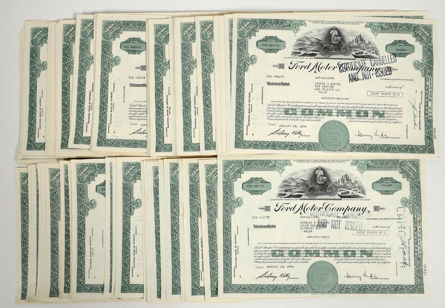 Dealer Group 1 Over 150 Ford Motor Company Specimen Stocks, 1968-1974. Henry Ford vignette with early car. Registered National Bank of Detroit. In 1974, Ford Motor Company's main headquarters were located in Dearborn, Michigan. The company also had a significant presence at the Highland Park Ford Plant in Highland Park, Michigan, where production ceased in 1974. See Photo.