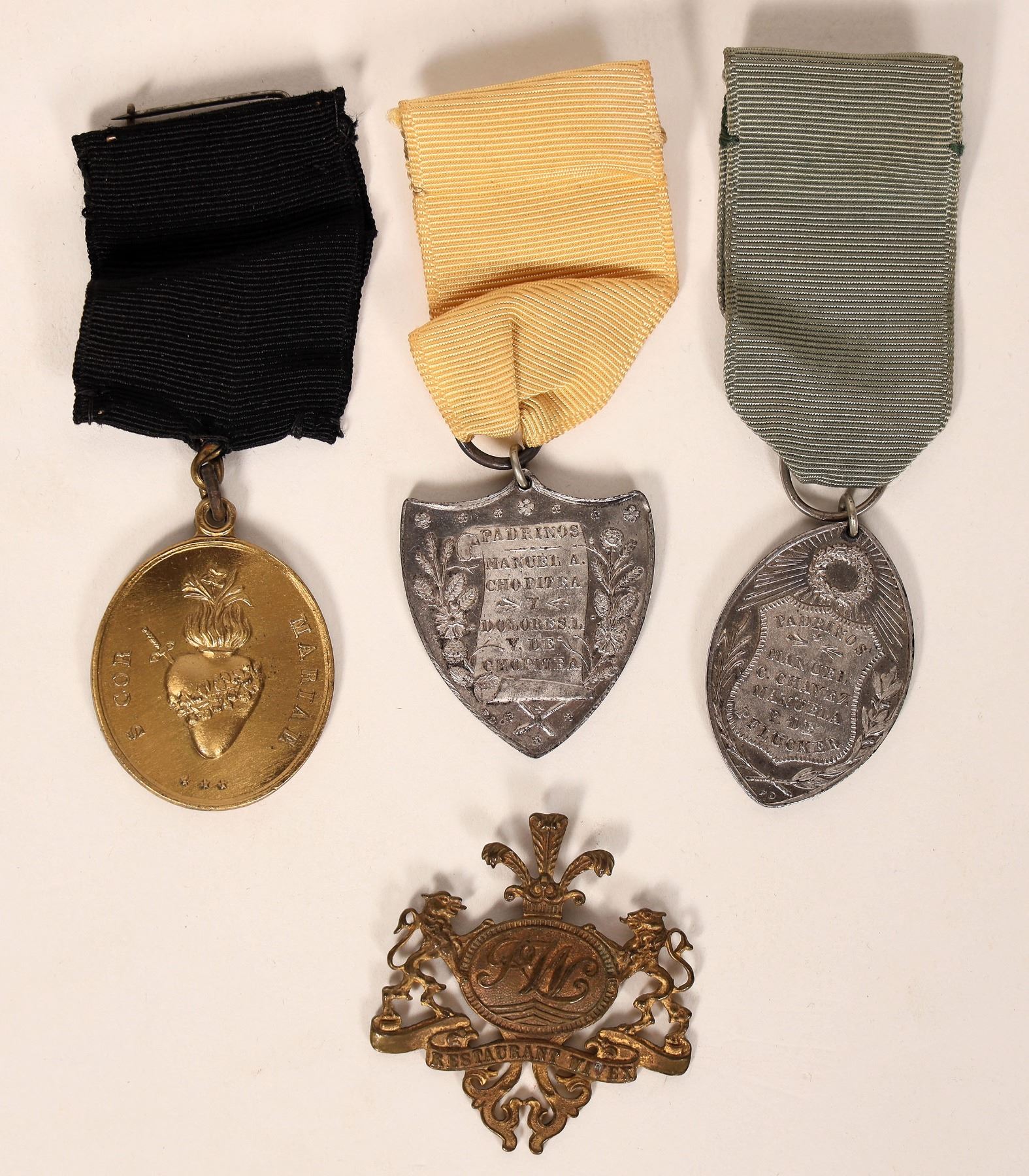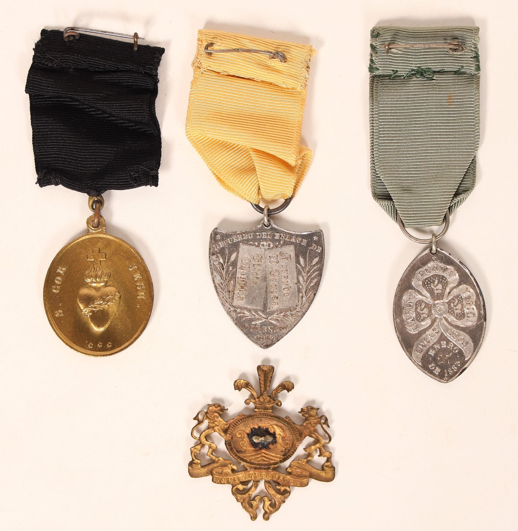 A group of four foreign badges measuring 1.5" to 3.5" long, three with ribbons and medallions. Two medallions appear to be silver. Please see photo(s) for more details.