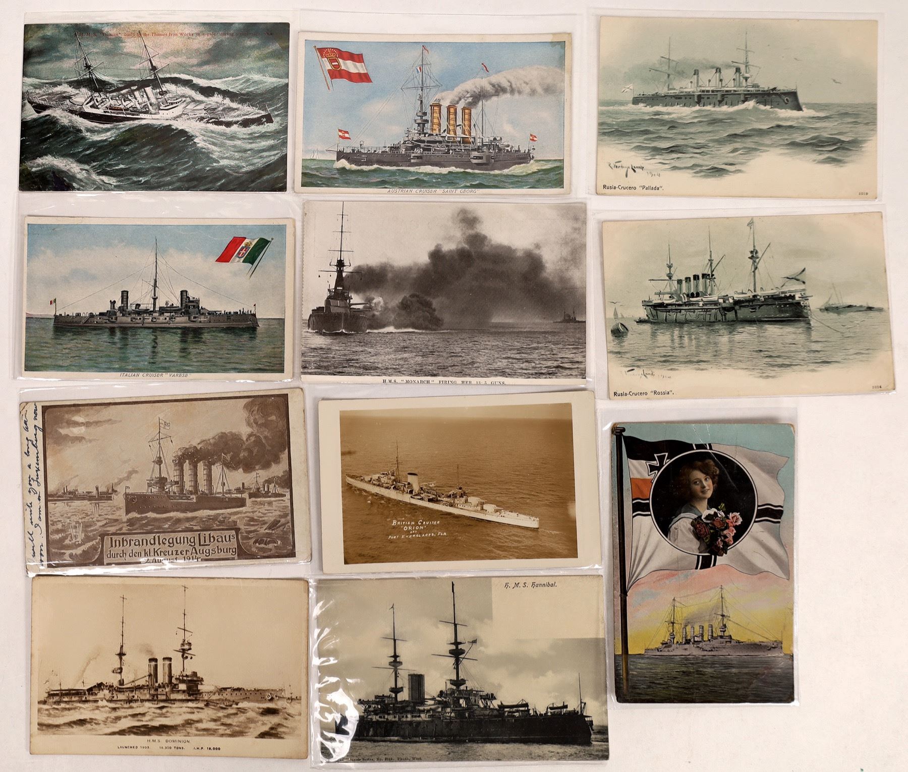 6 B&W printed and 4 color postcards of foreign battleships.