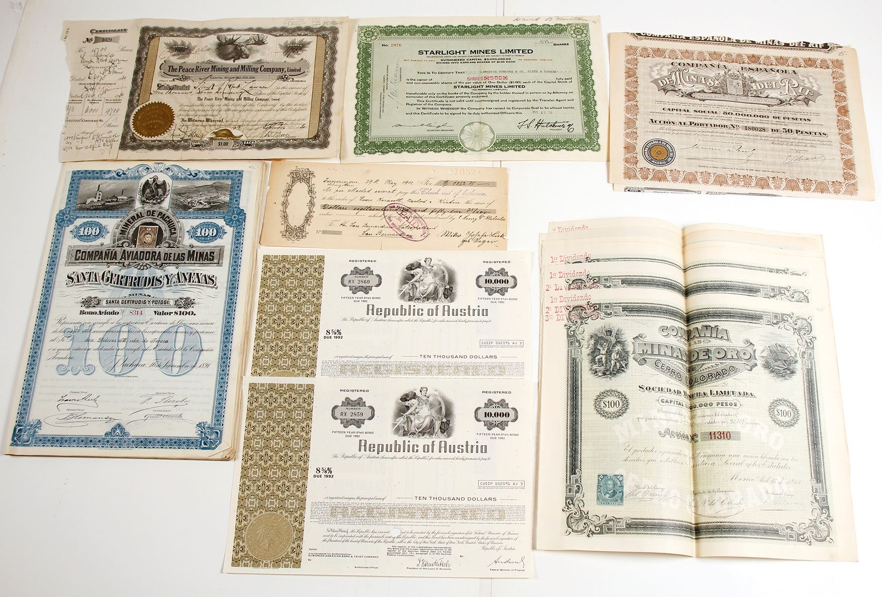 Lot of approx. 50 foreign bonds, Republic of Austria,Campania De Las Minas De Oro Cerro Colorado; Compania Espanola; Mineral De Pachuca Campania Aviadora De Las Minas & more. Date: late 1800's to 1900's Location: HWAC# 63944