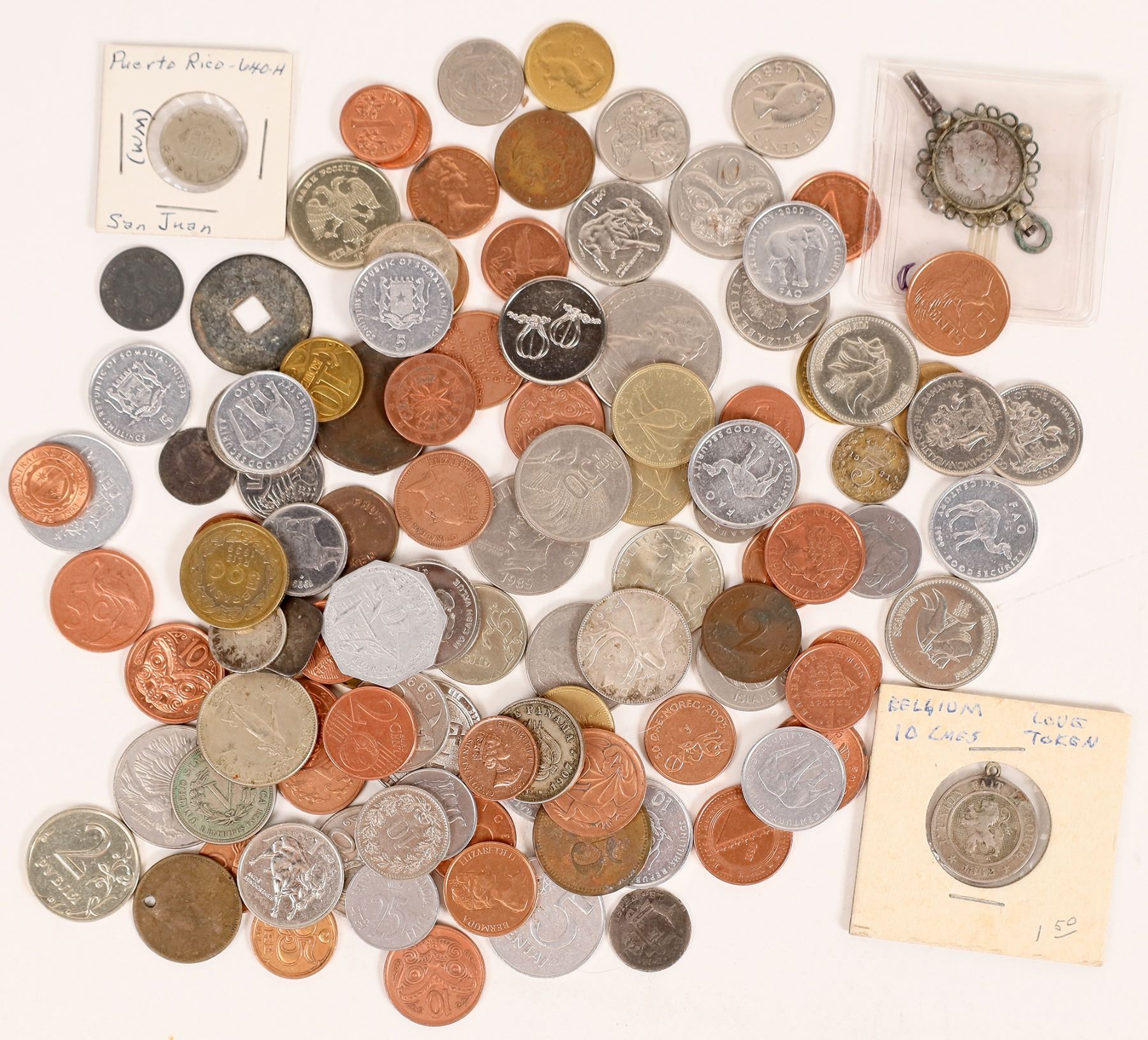 Over 110 foreign coins, plus an 1862 Belgium love token; San Juan Puerto Rico transportation token; 1834 two franc Belgium coin in elaborate jewelry mounting.