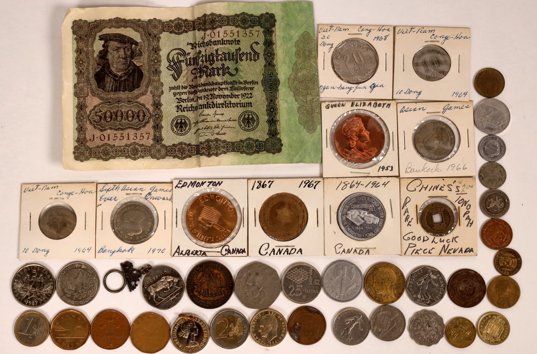 Lot of about 40 foreign coins and one 50000 mark Weimar Republic hyperinflation note. Canada, France, Vietnam, Thailand, Mexico, Spain and others.