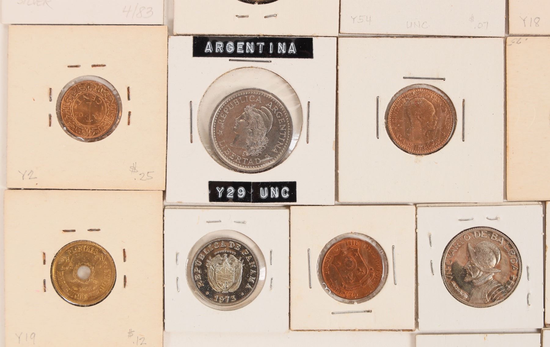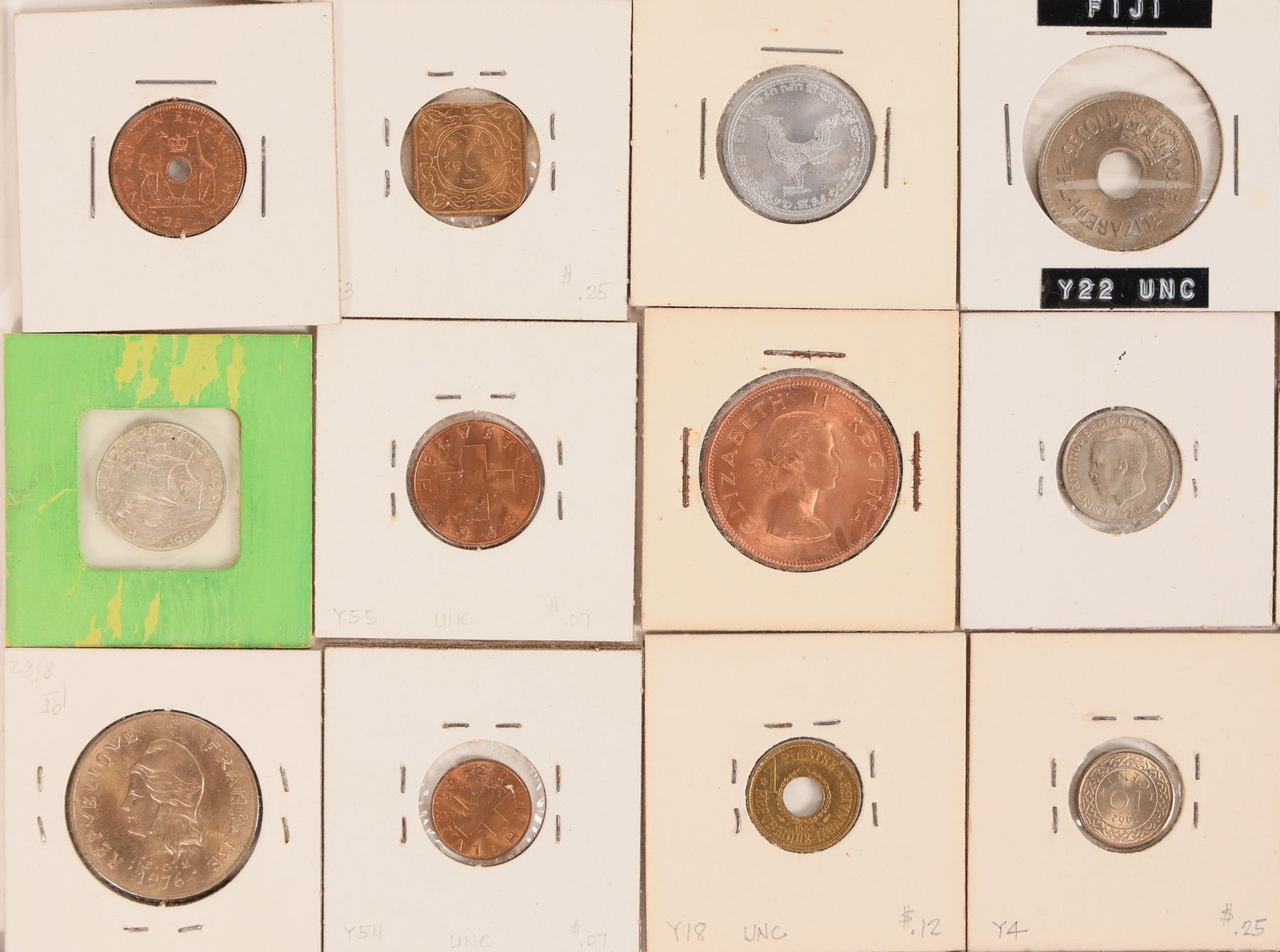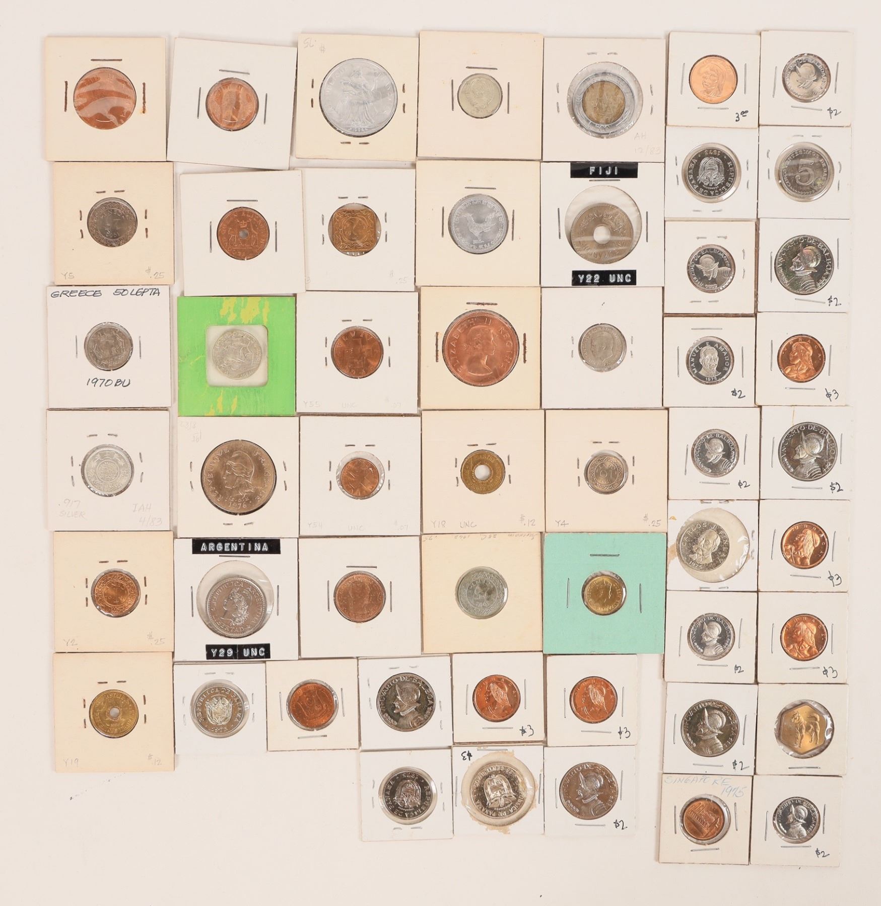 Foreign coins (52) in uncirculated condition, some proof. Argentina (1962 one peso); Fiji (1967); French Polynesia (1965); Italy (1982); Saudi Arabia (1935); Tahiti (1976); Greece (1970); Panama (about 20); Ghana; Philippines; South Africa; Surinam; Hong Kong. [ Foreign