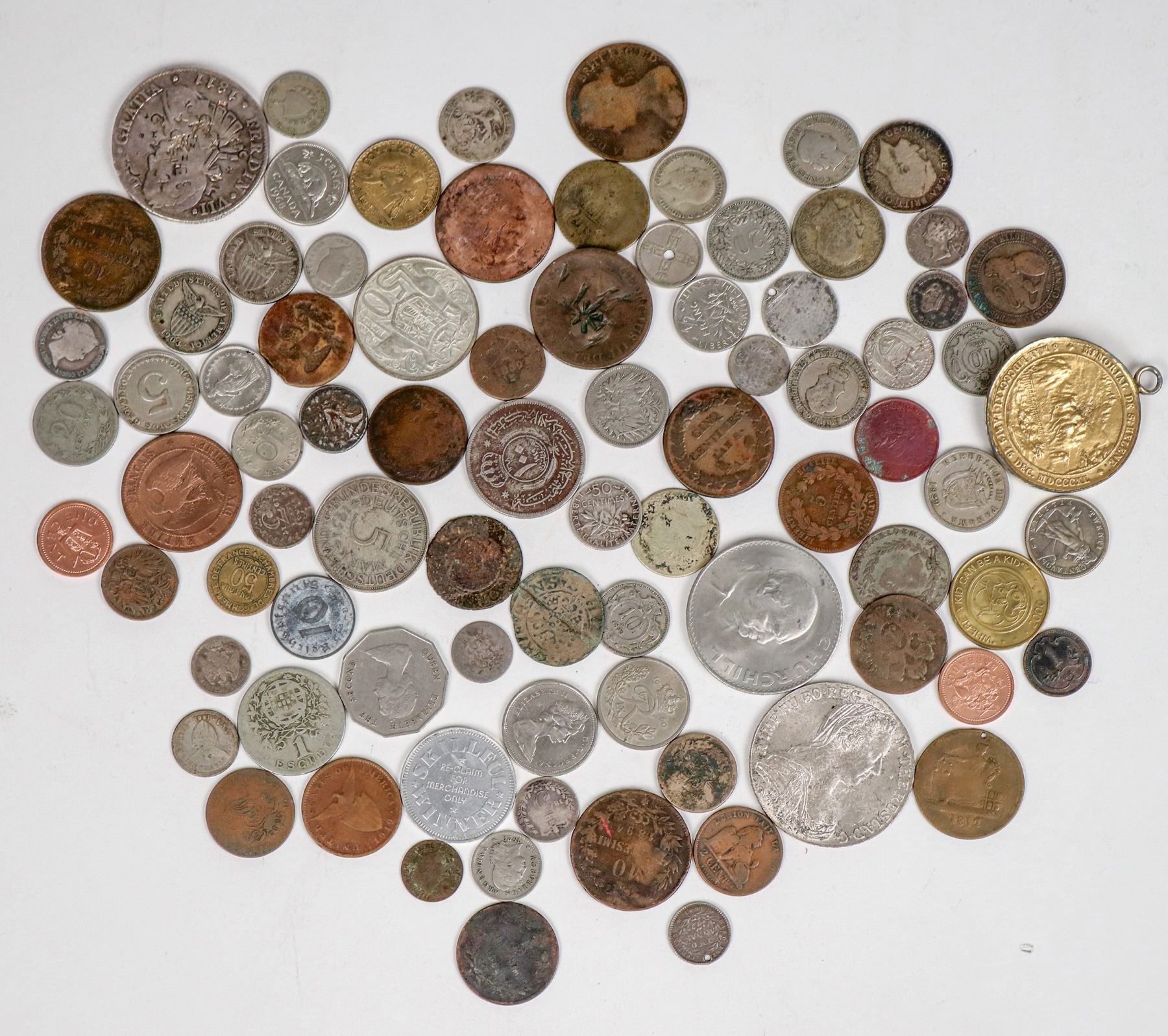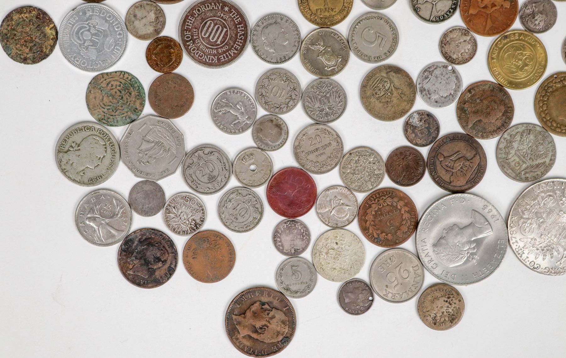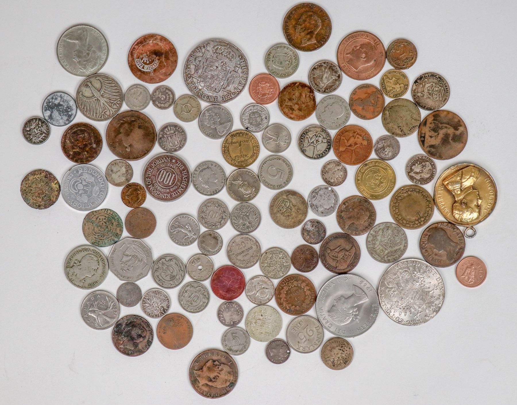 Lot of over 80 foreign coins. 1965 Churchill crown; Maria Theresa thaler; 1966 Australia 50 cent; 1927 Portugal one escudo; Germany; Philippines; The Hashemite Kingdom of the Jordan, 1949; Canada; Panama; 1917 France; 1894 Italy & many more.[ Foreign