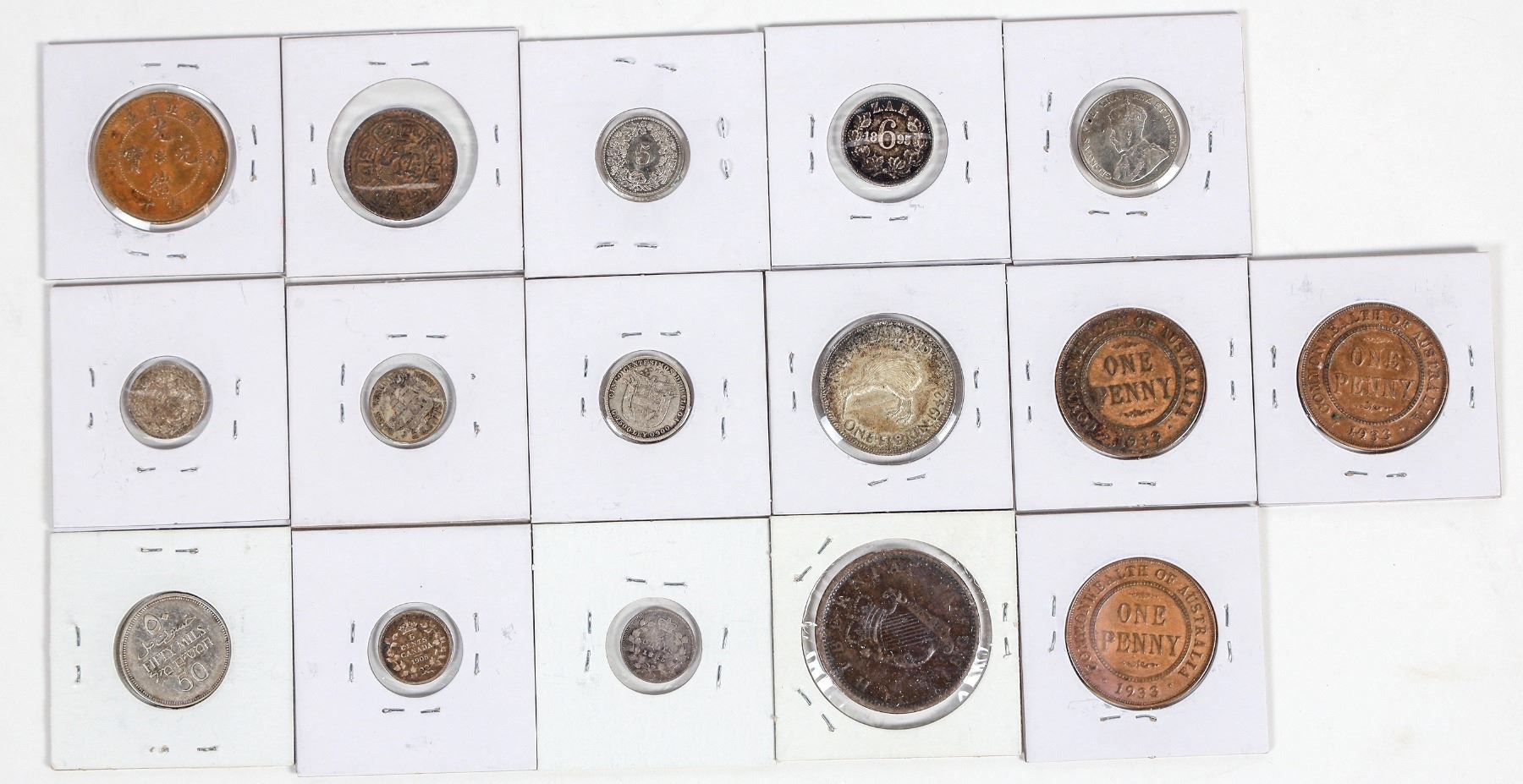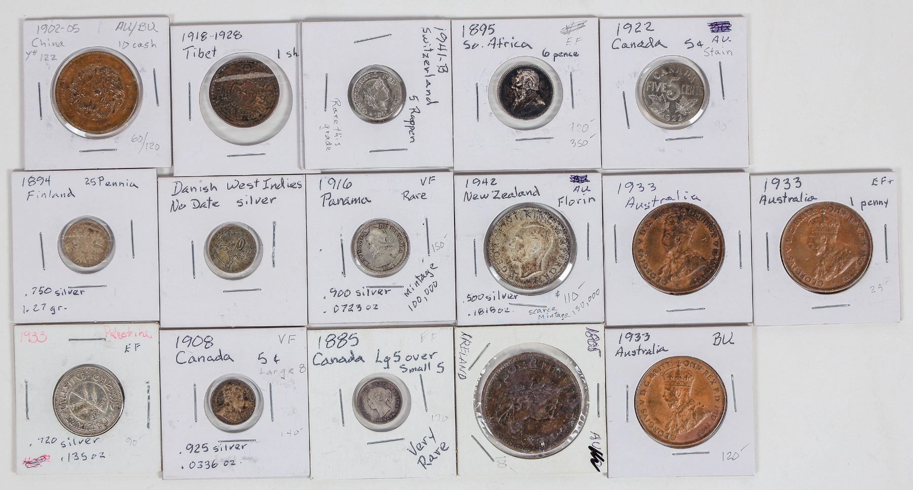 The end of a huge collection of foreign coins, these 16 coins got leftover: Ireland 1805 1/2 penny. Australia 1933 penny (3); Canada 1885 5c.; 1908 5c.; 1922 5c. China 1902-5 10 cash. Danish West Indies, no date, silver. Finland 1894 25 pennia. New Zealand 1942 florin. Palestine 1933 50 mils silver. Panama 1916 5c. South Africa 1895 6 pence. Switzerland 1941-B 5 rappen. Tibet 1918 1 sho.