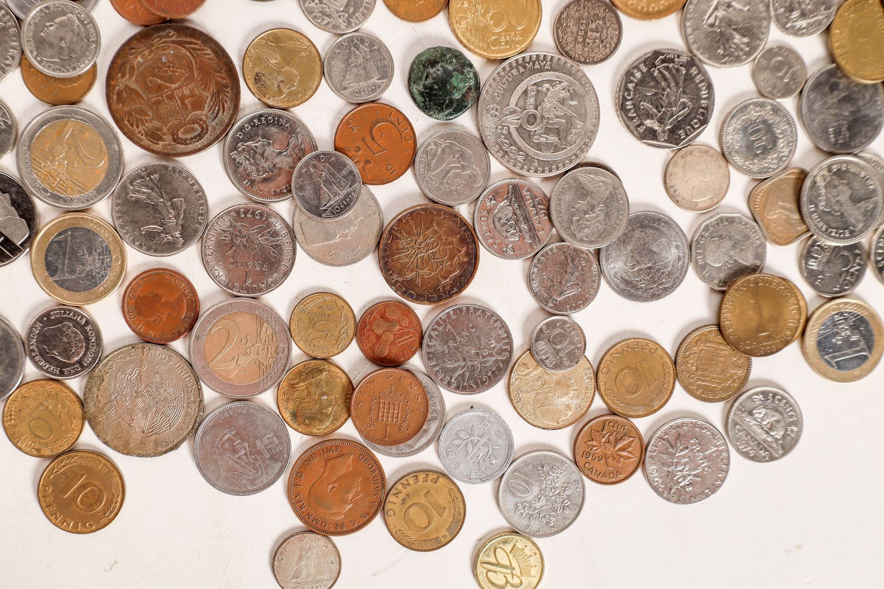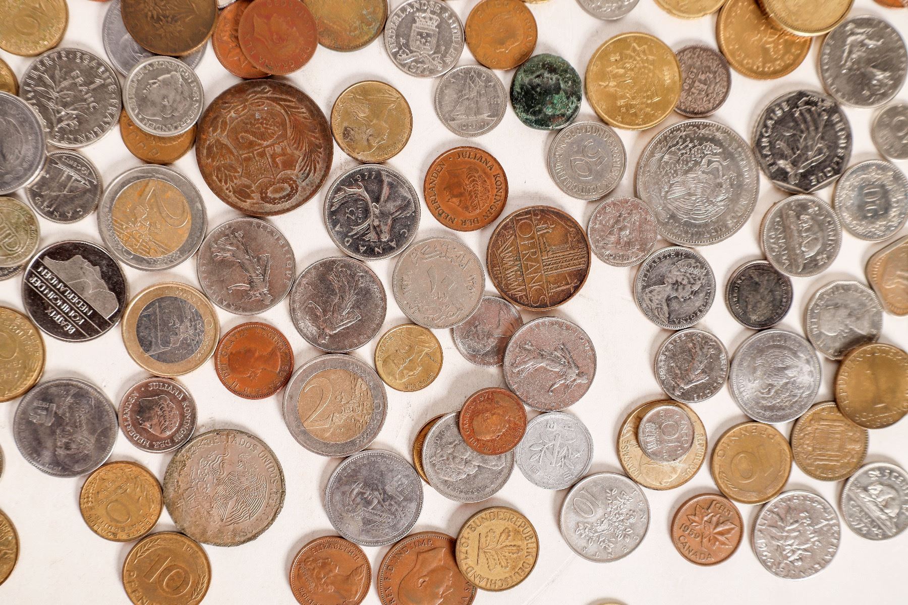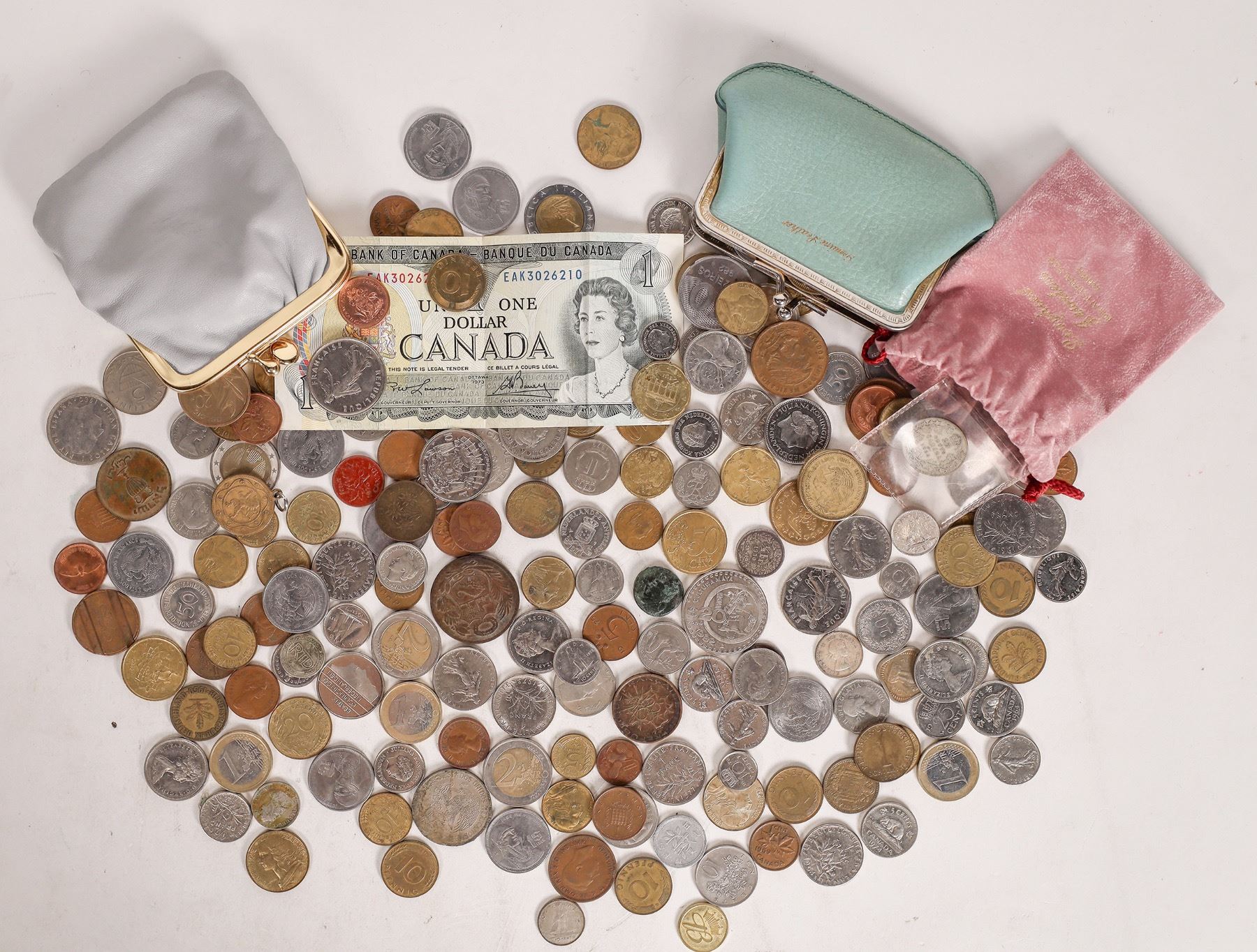 Over 180 foreign coins: Canada, Honduras, Mexico, Switzerland and other countries. Includes the two leather coin purses they came in.