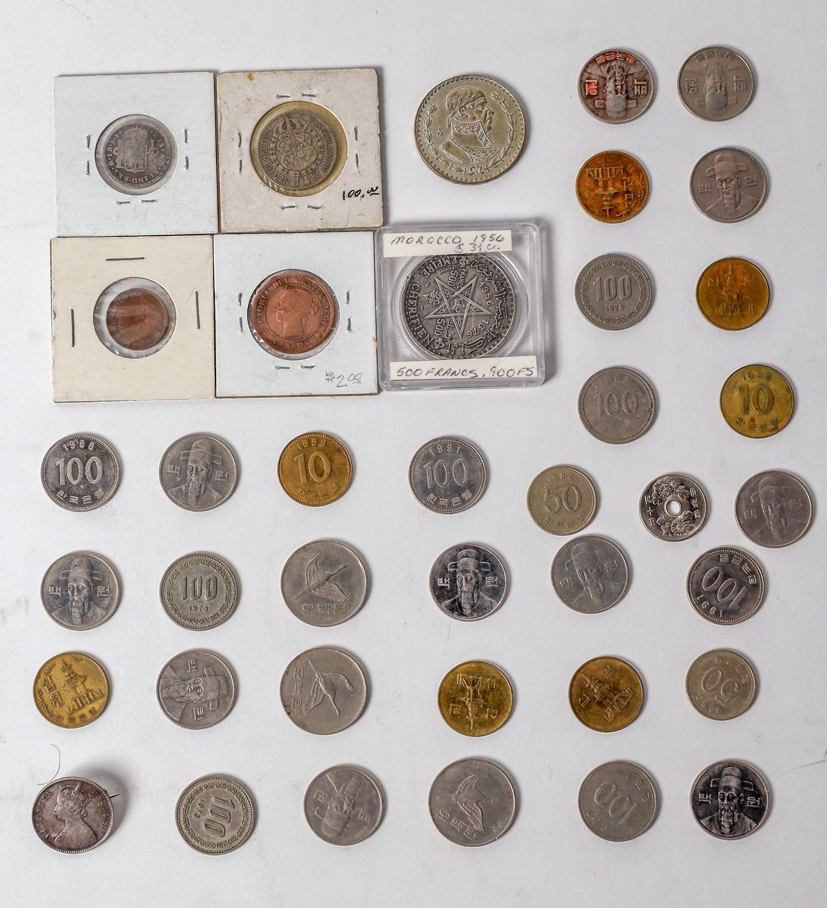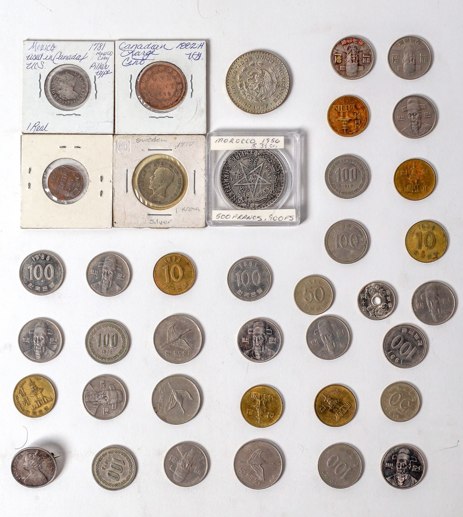 A box of 4.2 pounds of foreign coins. Including 1781 Mexico 1 real; 1957 & 1962 Mexico un peso (silver); 1956 Morocco 500 francs; 1882 Canadian Large Cent; 1884 half rupee with Queen Victoria made into a jewelry pin; 1901 one shilling with Victoria; 1910 Swedish one krona;1988 Marshall Islands commemorative of the space shuttle Discovery. Ukrainian stamps from 1923.