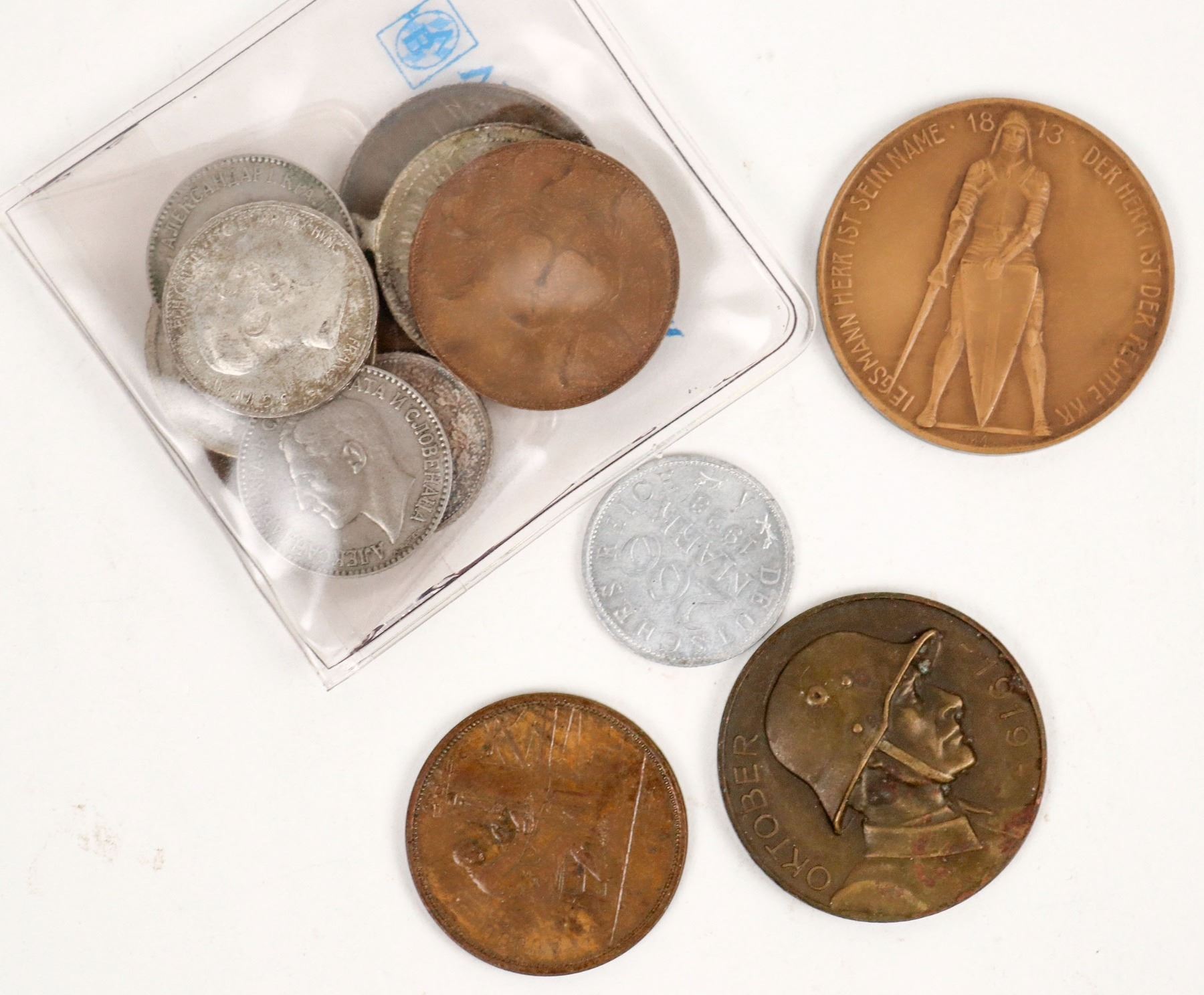 Lot of 13 pieces; two one Dinar Aleksandar I 1925 coins; 10 Centesimi - Victor Emmanuel III; 1907 German 1/2 mark; 1880 one krona Sweden; 1923 German 200 mark; 1908 one corona Austria; October 1919 German medal; 1913 Deutscher Patriotenbund medal.