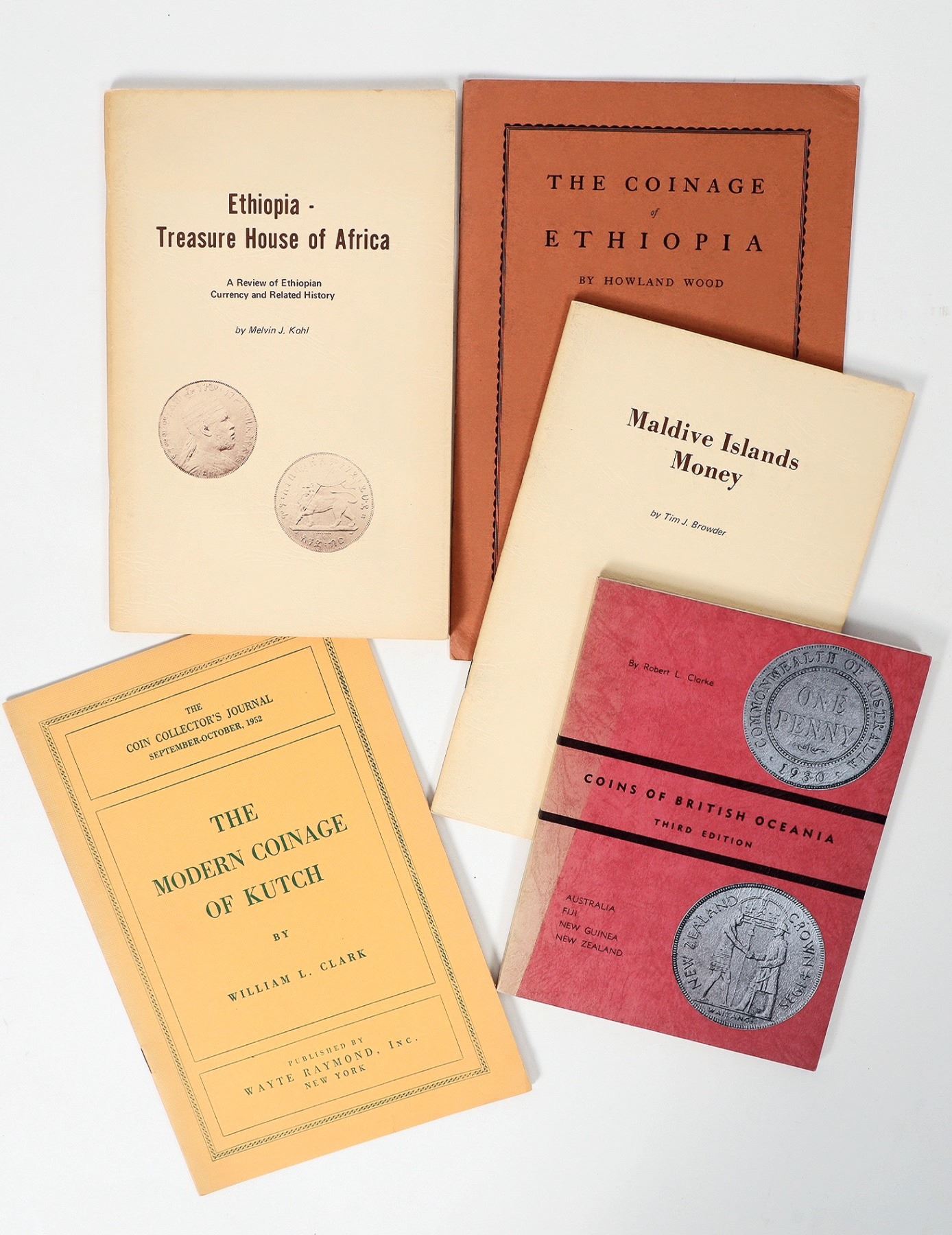 Ethiopia-Treasure House of Africa by Kohl, Maldive Island Money by Browder, Coins of British Oceana by Clarke, Modern Coinage of Kutch by Clark.[ Foreign