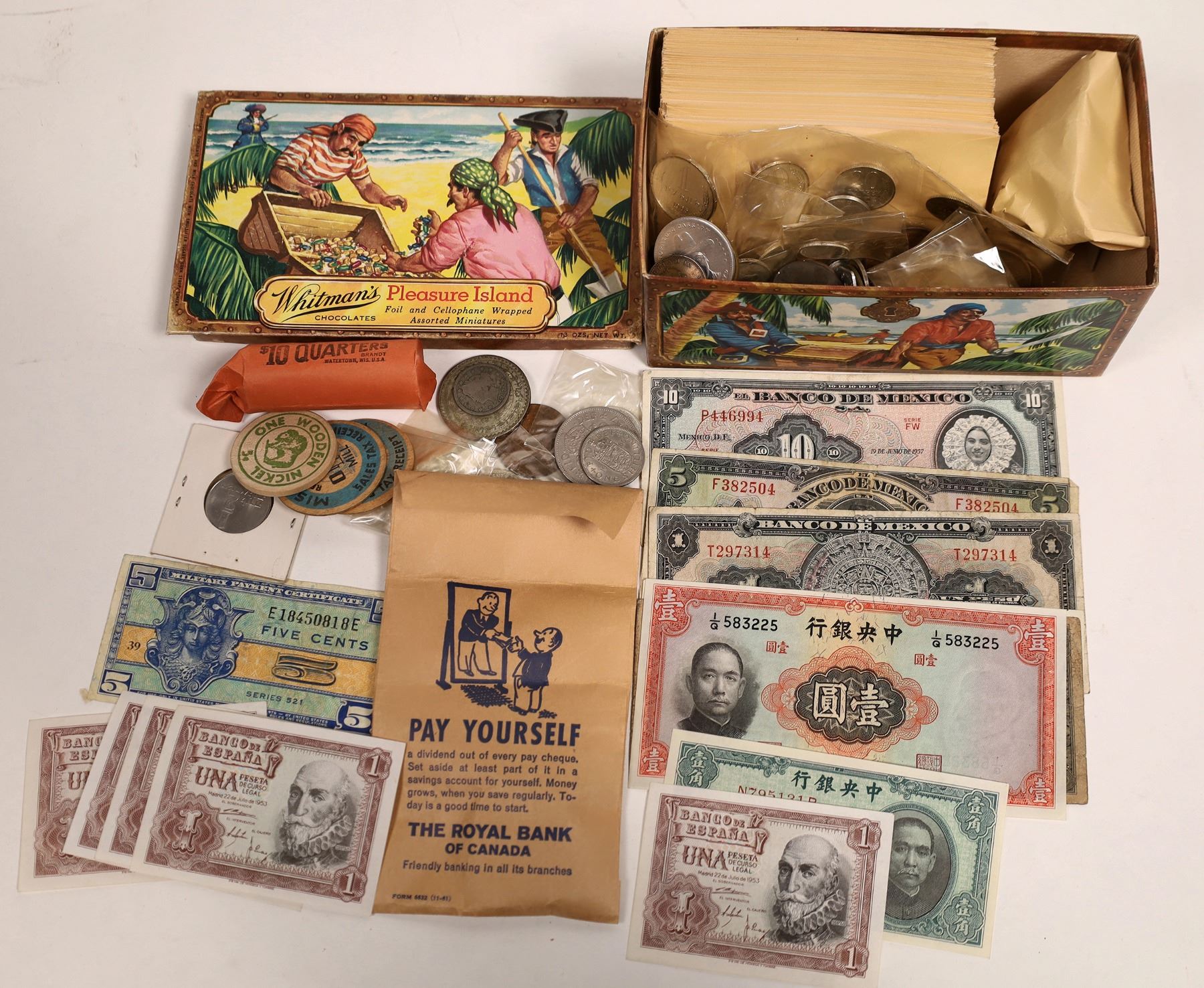 Pirates on the cover of the Whitman's chocolate "Pleasure Island" box: inside a packed variety of foreign coins. Mostly Canadian, including silver quarters, halves and a 1966 dollar. Coins from Russia, Philippines and many others. Fun to look through this accumulation. An envelope of Mexican and Japanese currency as well.