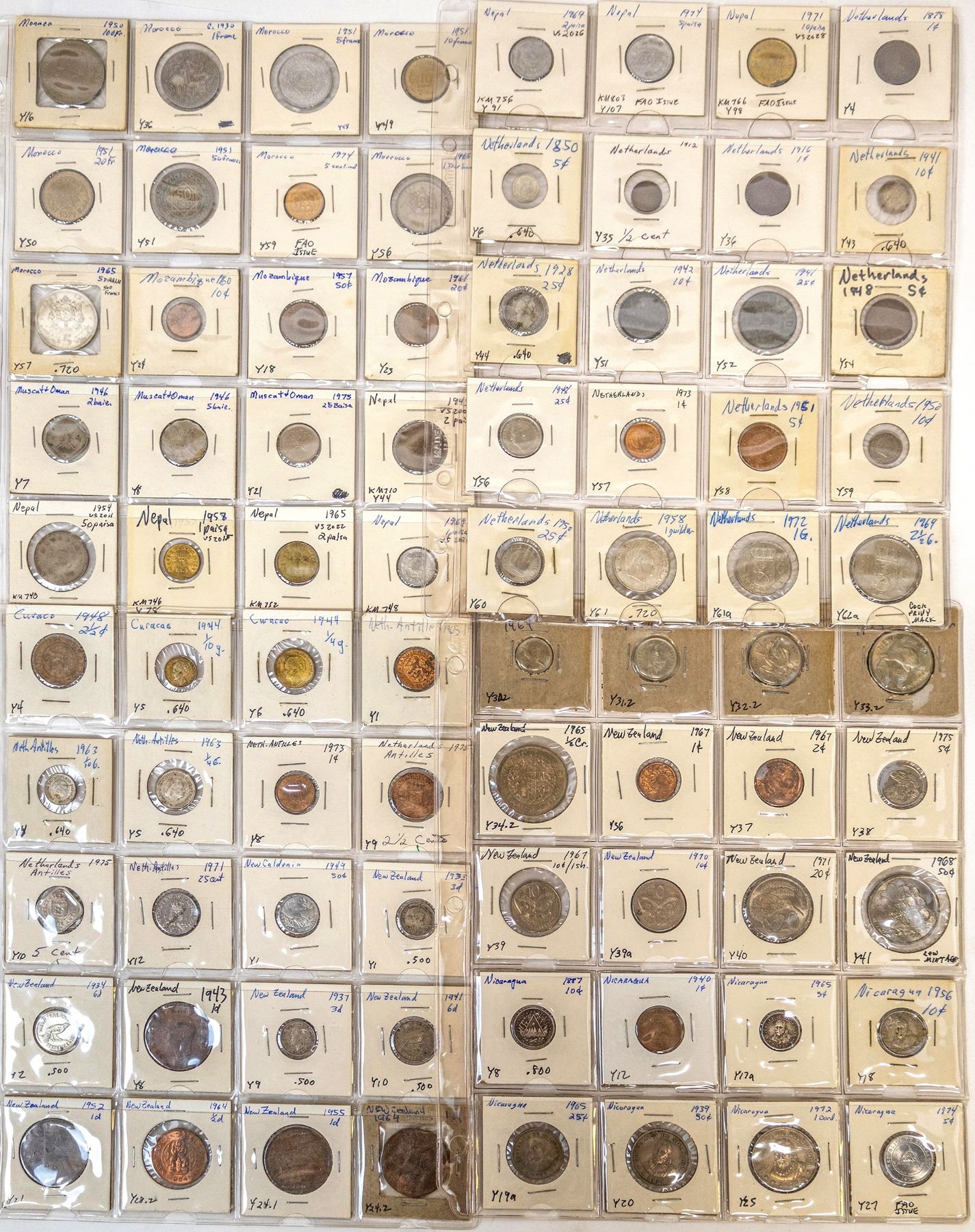 Lot of 81 coins from various countries: Monaco; Morocco (8); Mozambique (3); Muscat & Oman (3); Nepal (8); Netherlands (17); Netherlands Antilles (10); New Caledonia; New Zealand (21); Nicaragua (9). 1887 Nicaragua 10 cents; 1850 Netherlands 5 cents; 1878 Netherlands 1 cent; all others 20th century.