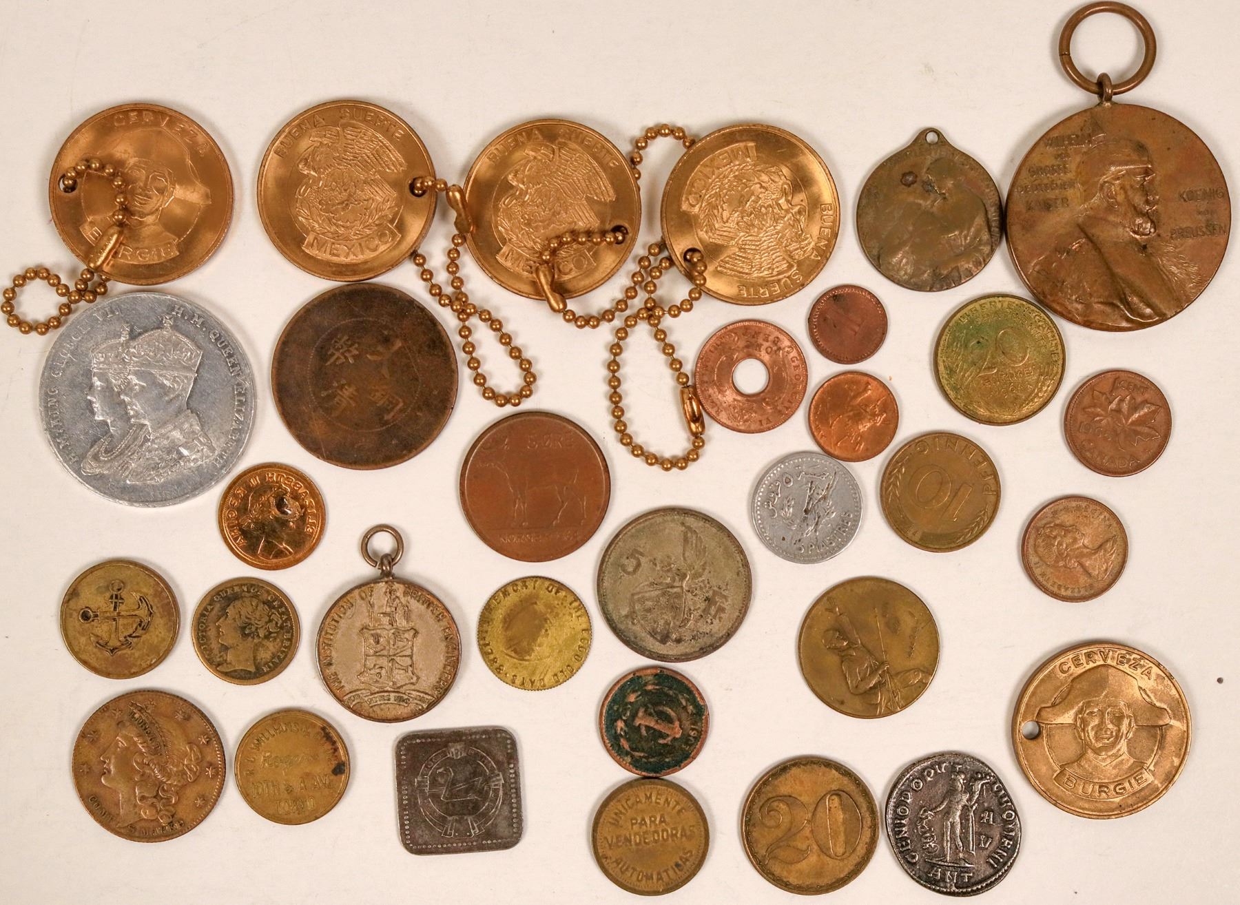 Group of 32 foreign coins, tokens and medals from all over the world, c1900s, mostly early. Interesting group includes tokens from Tokyo, Japan, a square token from Hamburg, Germany, a token from Mexico with Coca-Cola logo. A good variety of medals with holes and rings, coins and tokens both large and small. See photo for details.