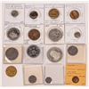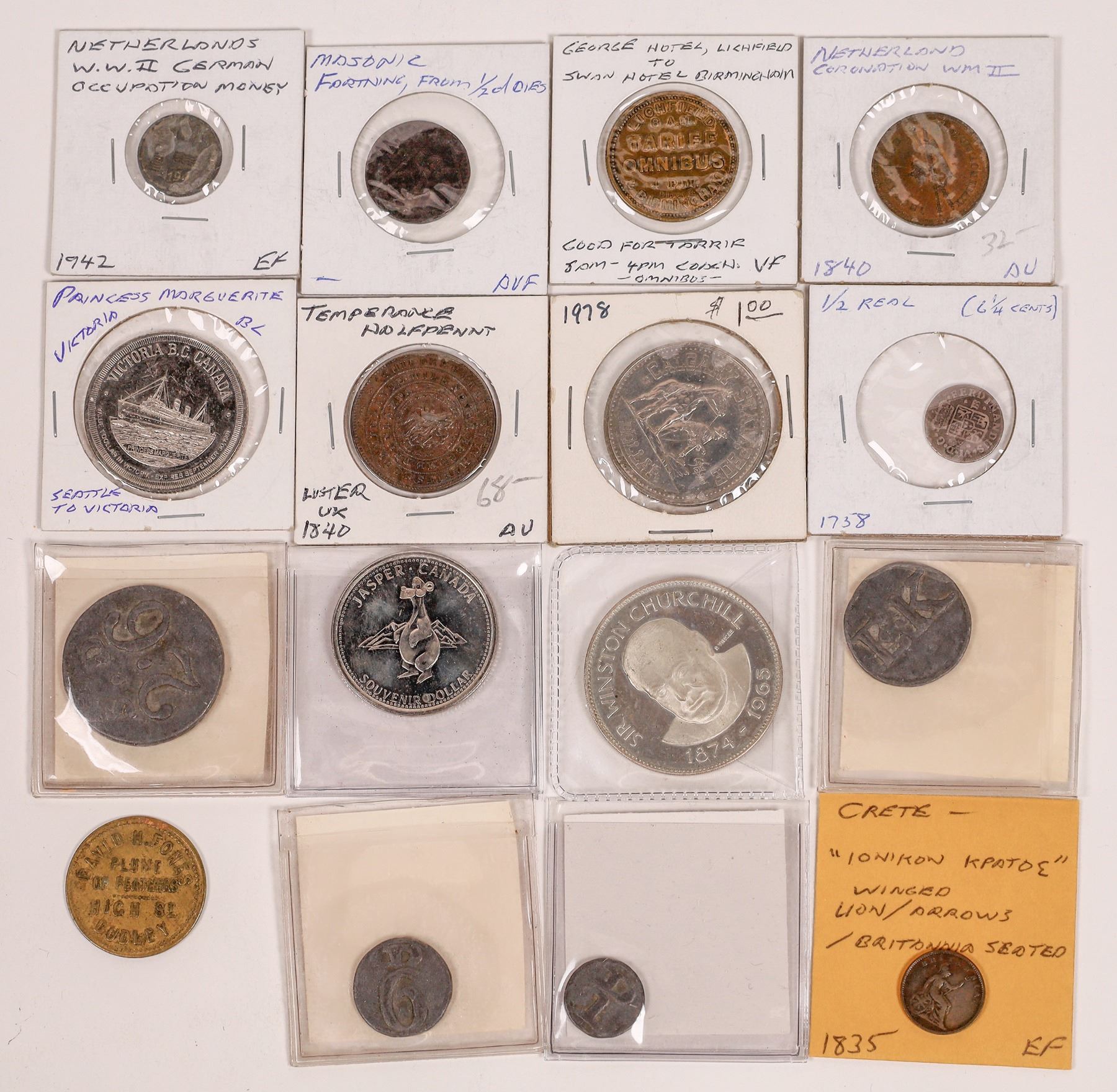 Lot of 16 coins and medals. Victoria, British Columbia; Temperance Half Penny; World War Two Netherlands German Occupation money; Winston Churchill; 1758 1/2 real from Spain; Jasper Canada; Crete; and others.