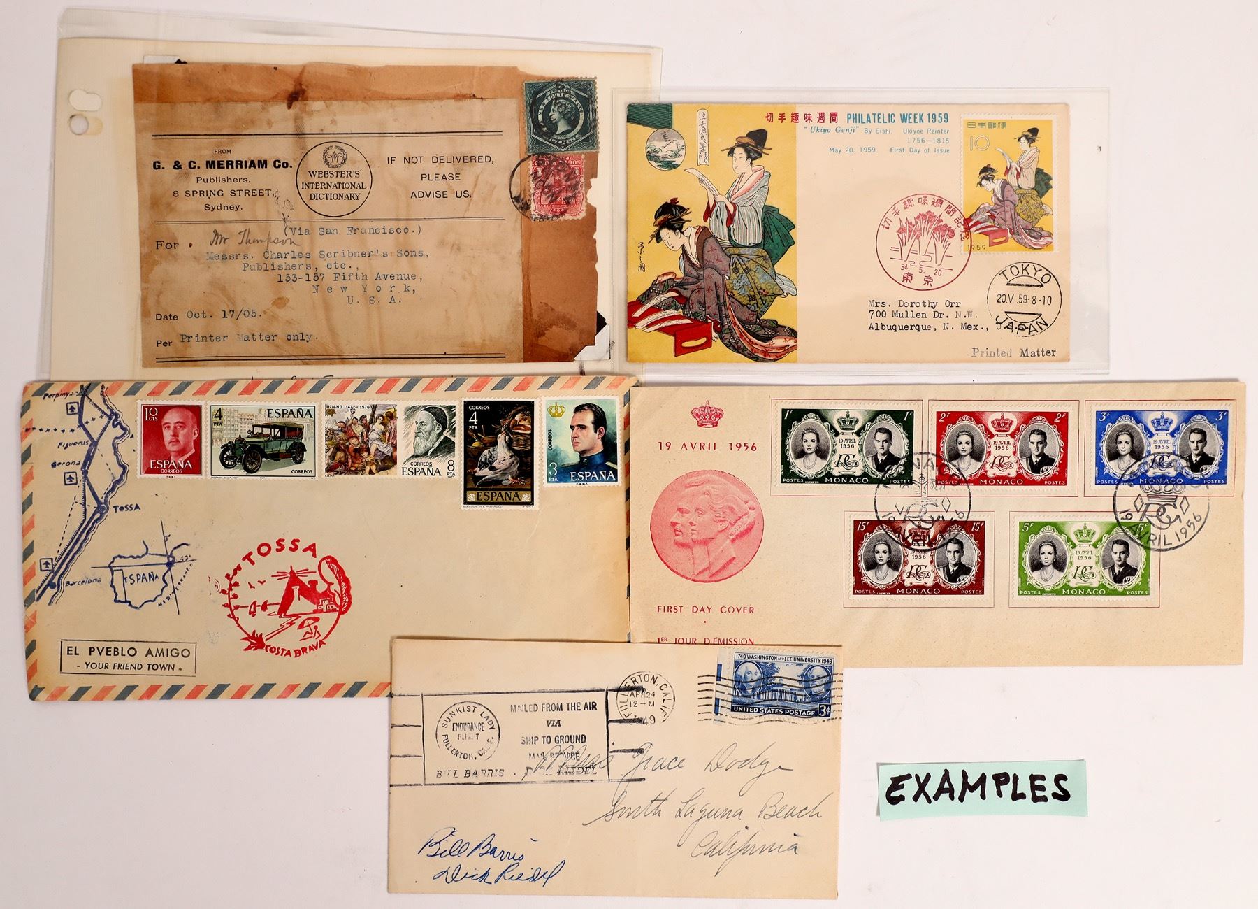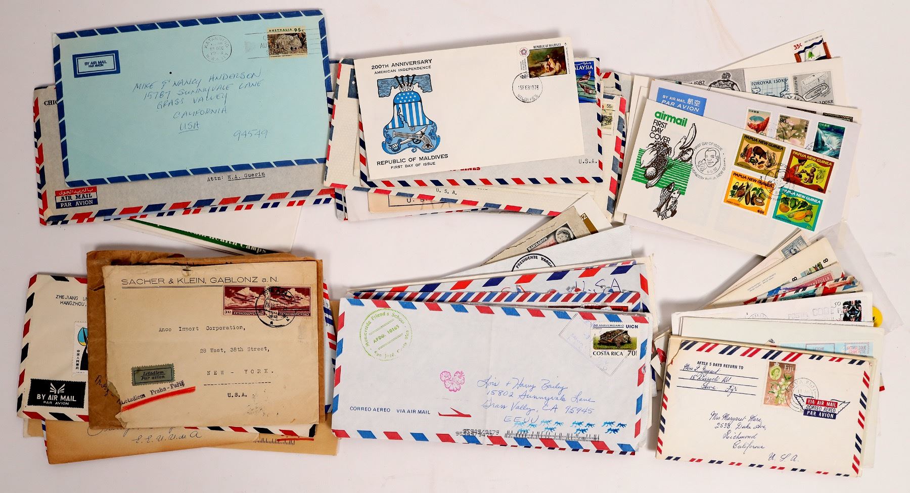 About 45 foreign covers, some philatelic related, a few cachets. Japan, Australia, Kuwait, New Zealand, Fiji, Saudi Arabia etc.