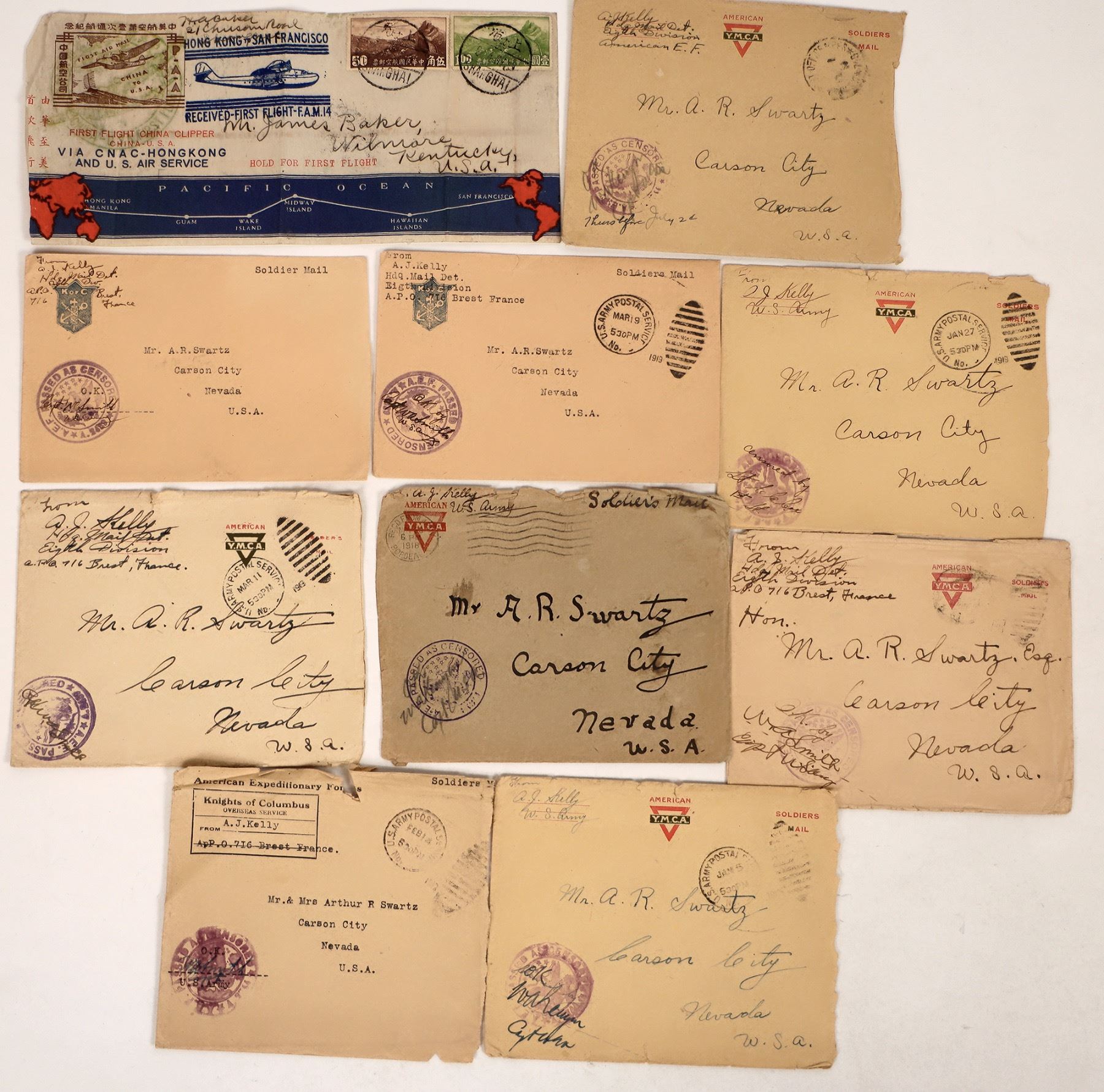 8 c. 1919 WW 1 censored Soldier Mail covers from France to USA without contents. Also, 1937 First Flight, Hong Kong to San Francisco cover-creases.