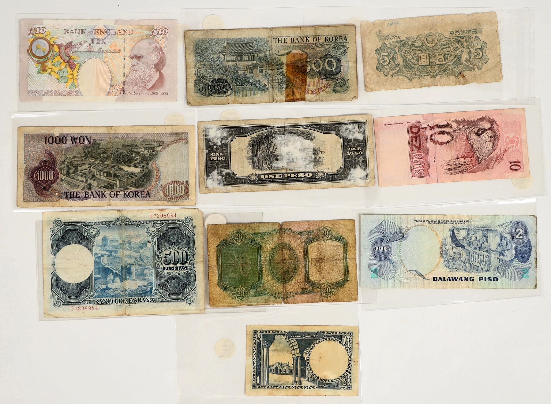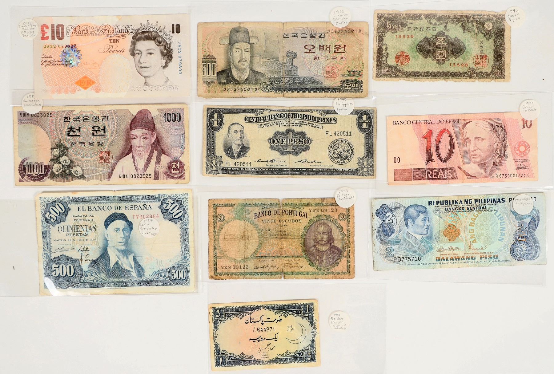 Eleven pieces of foreign currency: Bank of England 10 pound note 2000; 1973 South Korea 500 wan (2 notes); 1959 Portugal 20 escudo; 1994 Brazil 10 reis; 1949 Philippines 1 peso; 1953 Pakistan 1 rupee; 1983 South Korea 1000 wan; 1984 Philippines 2 peso; 1946 Japan 1 yen; 1954 Spain 500 pesetas.