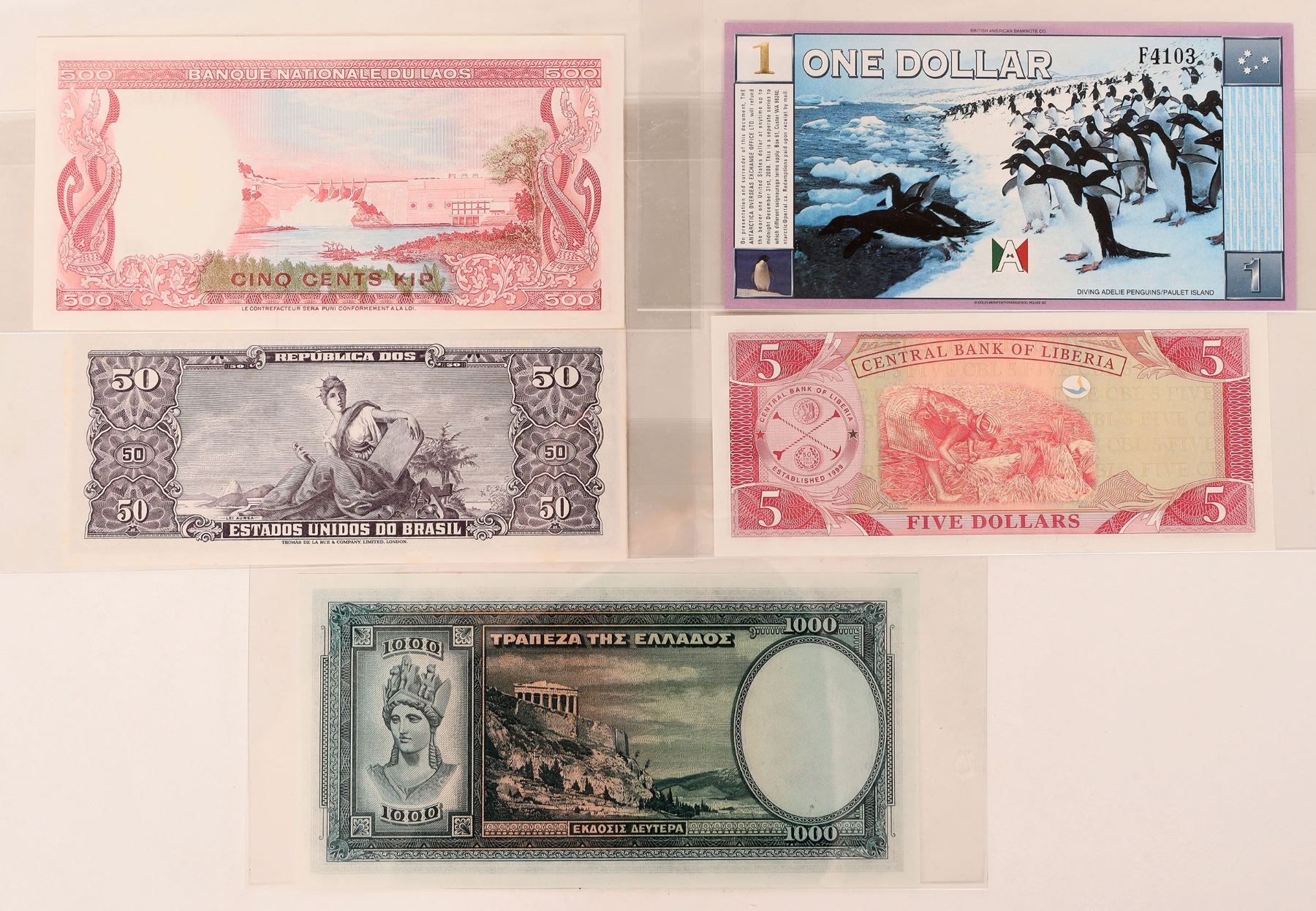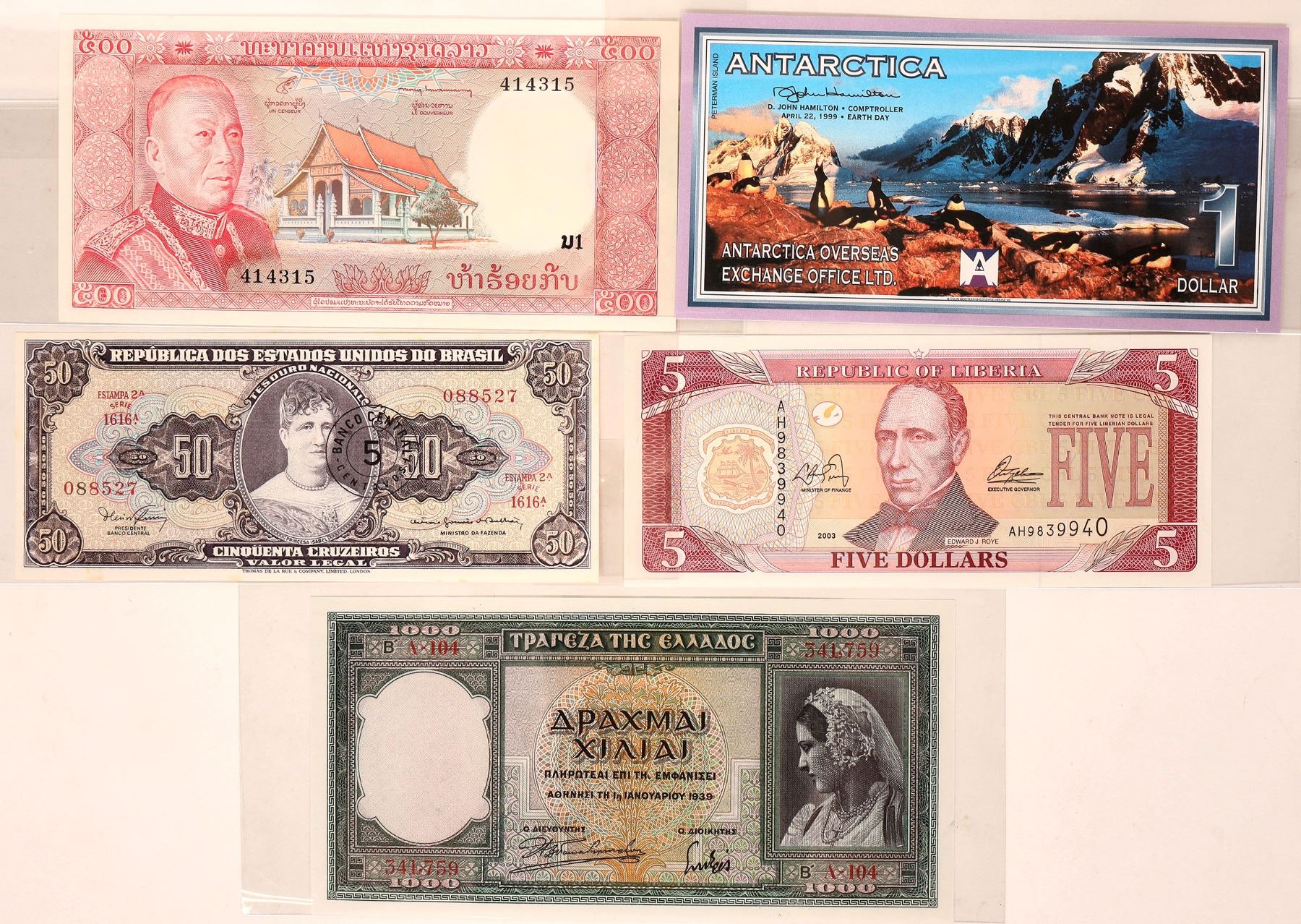 Lot of five crisp uncirculated notes from foreign countries: 1) Banque Nationale Du Laos 500 cents; 2) Republic of Liberia $5 (Edward J. Roye vignette); 3) Republica Dos Estados Unidos Do Brasil 50 cruzeiros (Princesa Isabel vignette); 4) Antarctica $1 Earth Day April 22, 1999; 5) Greece 1000 Drachmai. [] [] [] [] []