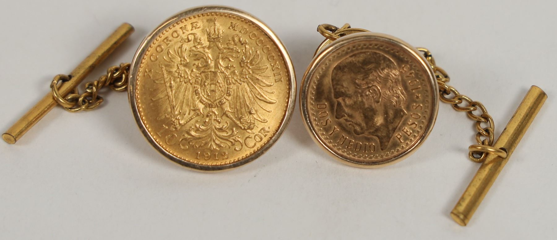 Created by Reno Jeweler Morgan Smith (who retired in 1966) two lapel pins to anchor your necktie during the Washoe Zephyr. Each has a gold coin: 1) 1945 Mexican 2 1/2 peso: Gold (.900); 2.0833 grams, 15.5 mm. (total weight: 6.3 grams) 2) 1912 Austrian ten corona: Gold (.900), 3.3875 grams; 19 mm. (total weight: 10.2 grams).