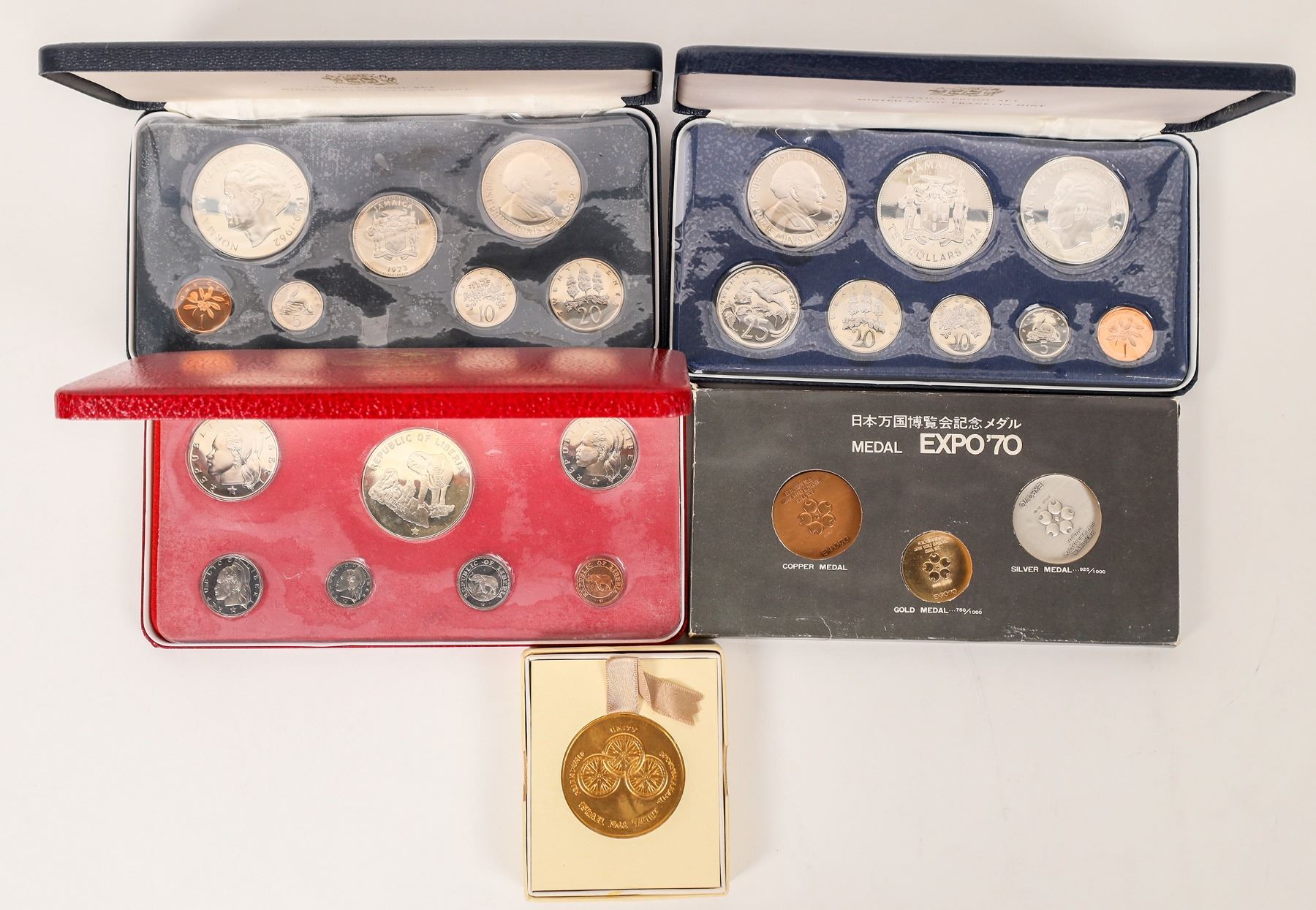 Lot of five: 1) 1975 Republic of Liberia proof set; seven coins in original case, 0.9625 oz. ASW; 2 & 3) two Jamaica Proof Sets minted at the Franklin Mint: 1973 seven coins in original case, 1.233 oz ASW; 1974 eight coin set in original case, 1.8772 oz. ASW. 4) 1968 Israel State Medal: International Stoke-Mandeville Games; brass, 45 mm, in original box. 5) 1970 World Expo in Osaka, Japan: Gold, Silver, and Copper Medal Set. The gold medal, designed by Kohei Sugiura, weighs 13.4 grams of 750/1000 fine gold or .3232 ounces of 24kt gold. The silver medal, designed by Churya Sato, weighs 18.5 of 925/1000 fine silver or .5502 ounces of pure silver. The copper medal, designed by Shigeo Fukuda, who also designed the obverse of the medals, weighs 15.7 of pure copper. The Medals are held in a plastic case and comes with the original cardboard box.