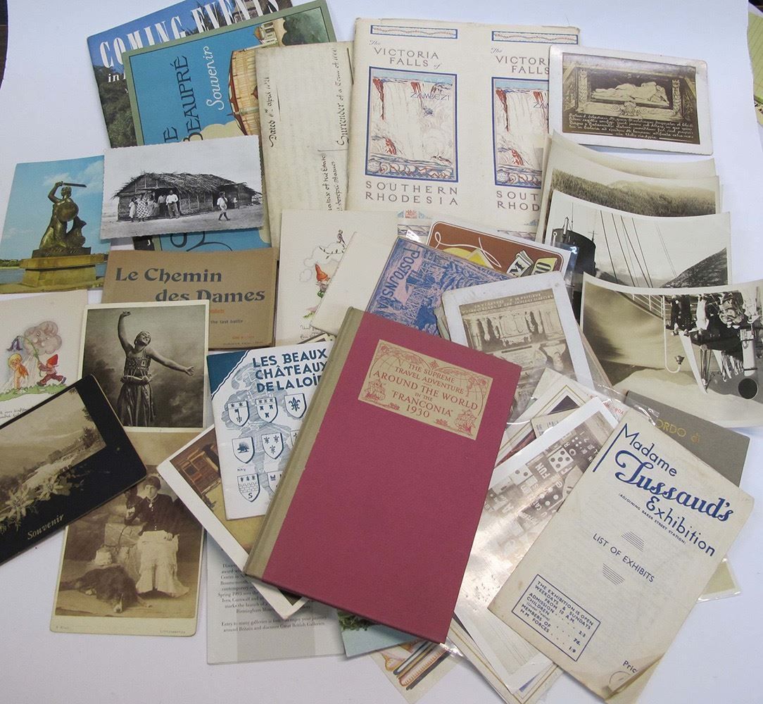 A "Grab Bag" with approx. 100 pieces of RPC's, magazines, stereo cards and much more from around the world including 1) "Coming Events in Britain" Magazine dated 1954; 55 pp.; 2) a book entitled "The Victoria Falls of Zambezi, Southern Rhodesia" from 1936 featuring black and white pictures, 69 pp.; 3) A document called "This Indenture" from the time of the Reign of King George IV, the "Regency Era", dated 6th of April 1821, a name appearing to be "Tim Barnes" next to the red wax seal on parchment paper. This document is in excellent condition except for one small area that appears to be slight soiling on reverse side of document. There are no tears. All words are legible. 22" x 28"; 4) Le Chemin des Dames "After the Last Battle", Series IV - 1918, 16 black & white post cards in a booklet 3.5" x 6"; 5) Many old post cards from Tahiti, France, Spain; 6) a stereo card of Eiffel Tower from the Trocadero, Paris Exposition, 1900; 7) six post cards of Monaco featuring S.A.S. Rainier III; 8) a book of "Circuit des beaux Chateaux de la Loire" featuring black & white pics of many Chateaux.18 pp. "5.5 x 4.25". So much more in this "Grab Bag." Date: c. Early 1800's through mid 1900's Location: France HWAC # 54271
