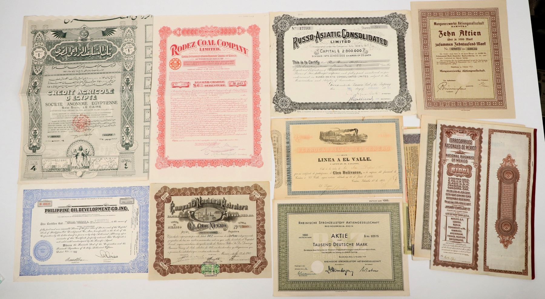 Group of 13 stock and bond certificates from railroad and mining companies around the world, dated 1883 to 1962. All issued, all uncancelled. Lot includes certificates from Bolivia, Mexico, Great Britain, Germany, Russia, Egypt, and the Philippines. Lot is generally in good condition, several still have intact or mostly intact sheets of bond coupons attached. Make sure to check the photos; these pieces have some excellent designs, especially one particularly striking Egyptian certificate that features bold Arabic typography alongside a vignette of an ancient Egyptian Pharoah and hieroglyphics.