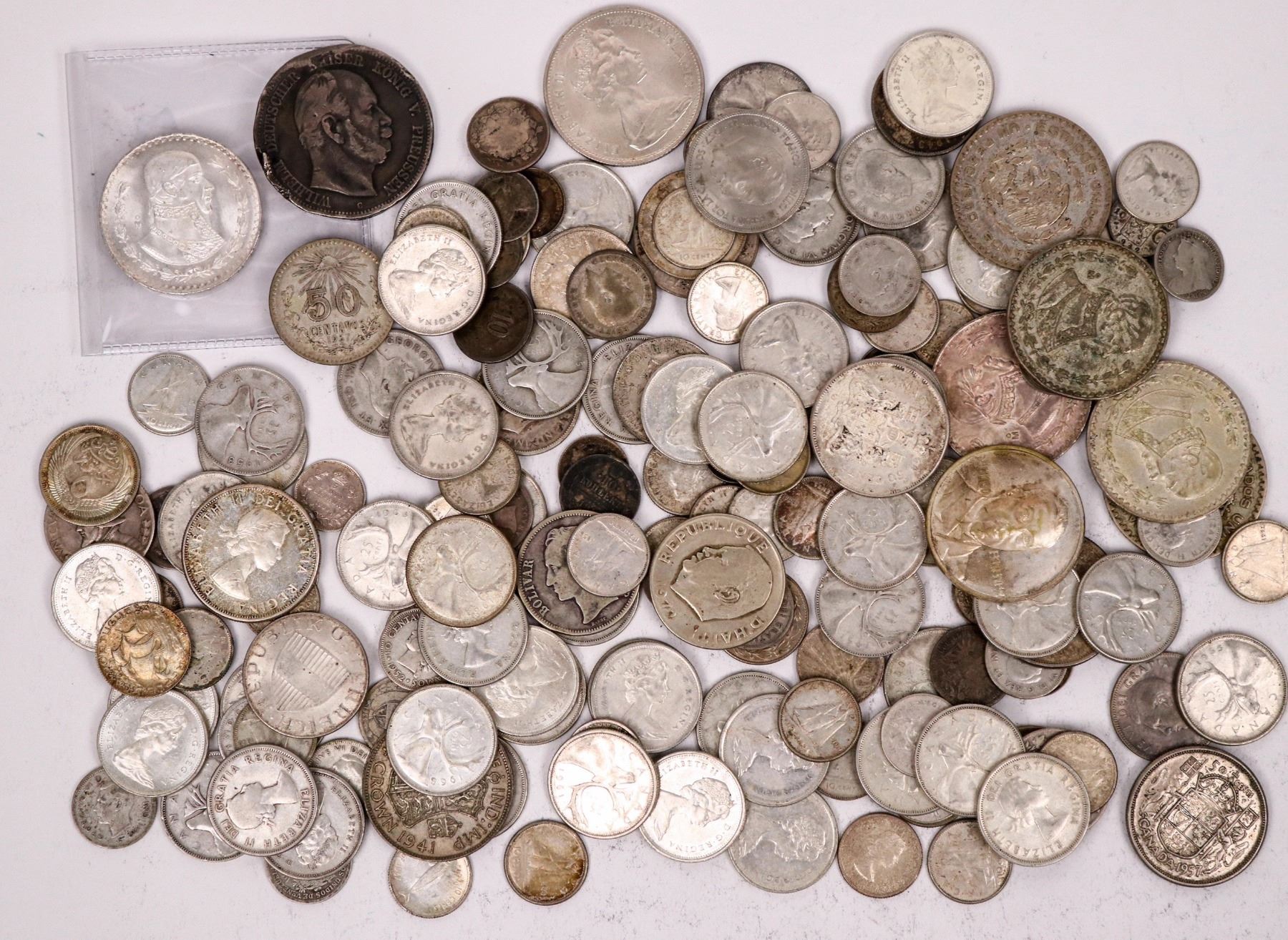 Bag of about 180 foreign silver coins. Six Mexican one peso coins; 1876 Prussian five mark; 1959 Bahamas dollar; many Canadian quarters; 1920 one franc French; quarter real 1909. Bag weighs 1 pound 13 ounces.