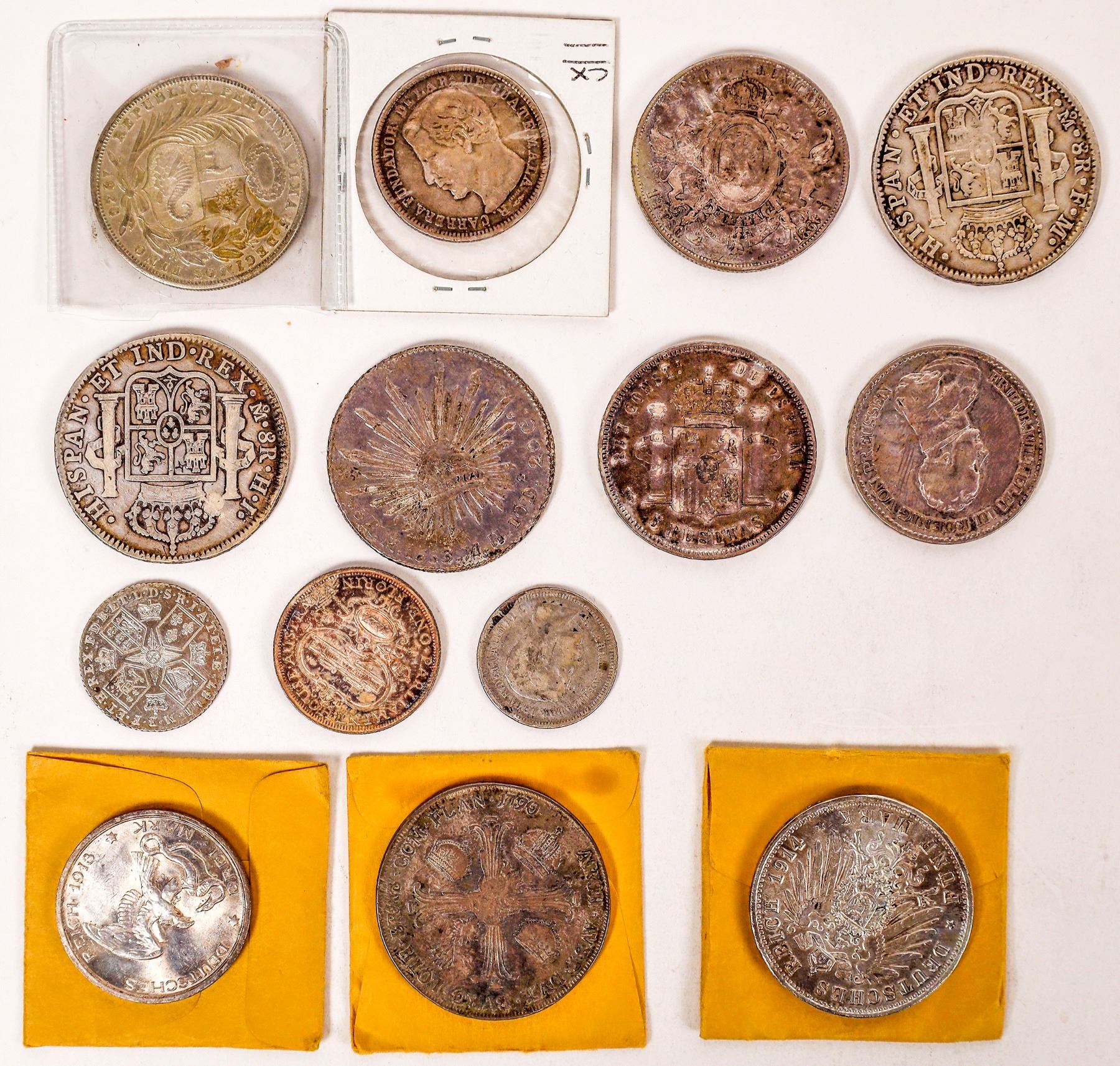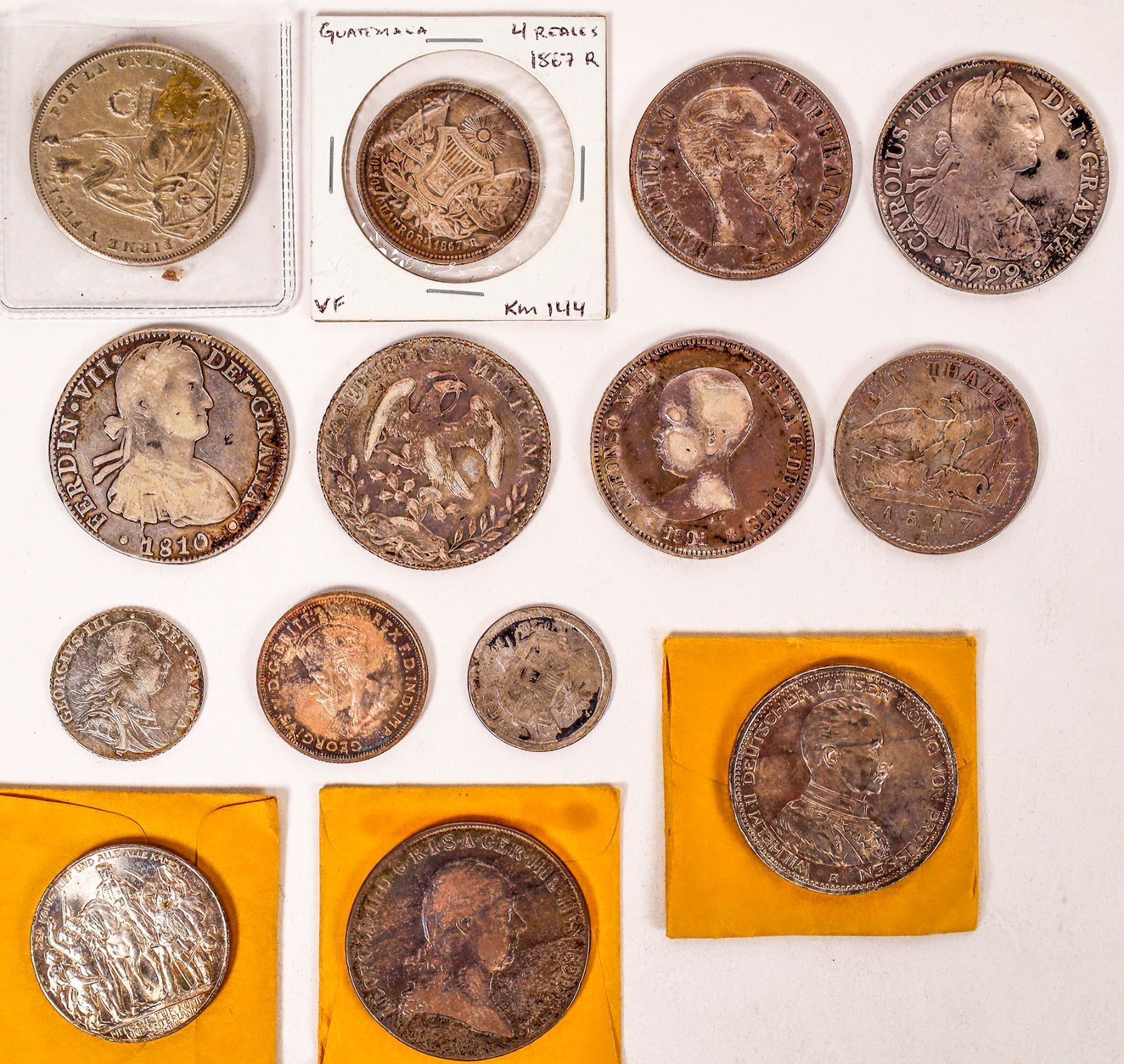 Lot of fourteen foreign silver coins. 1833 Mexican 8 reales; 1810 Spanish 8 reales (with chopmark); 1799 8 reales; 1866 Maximiliano un peso; 1926 Peru un sol; 1891 Alfonso XIII five pesetas; 1927 one florin; 1867 Guatemala four reales and others.