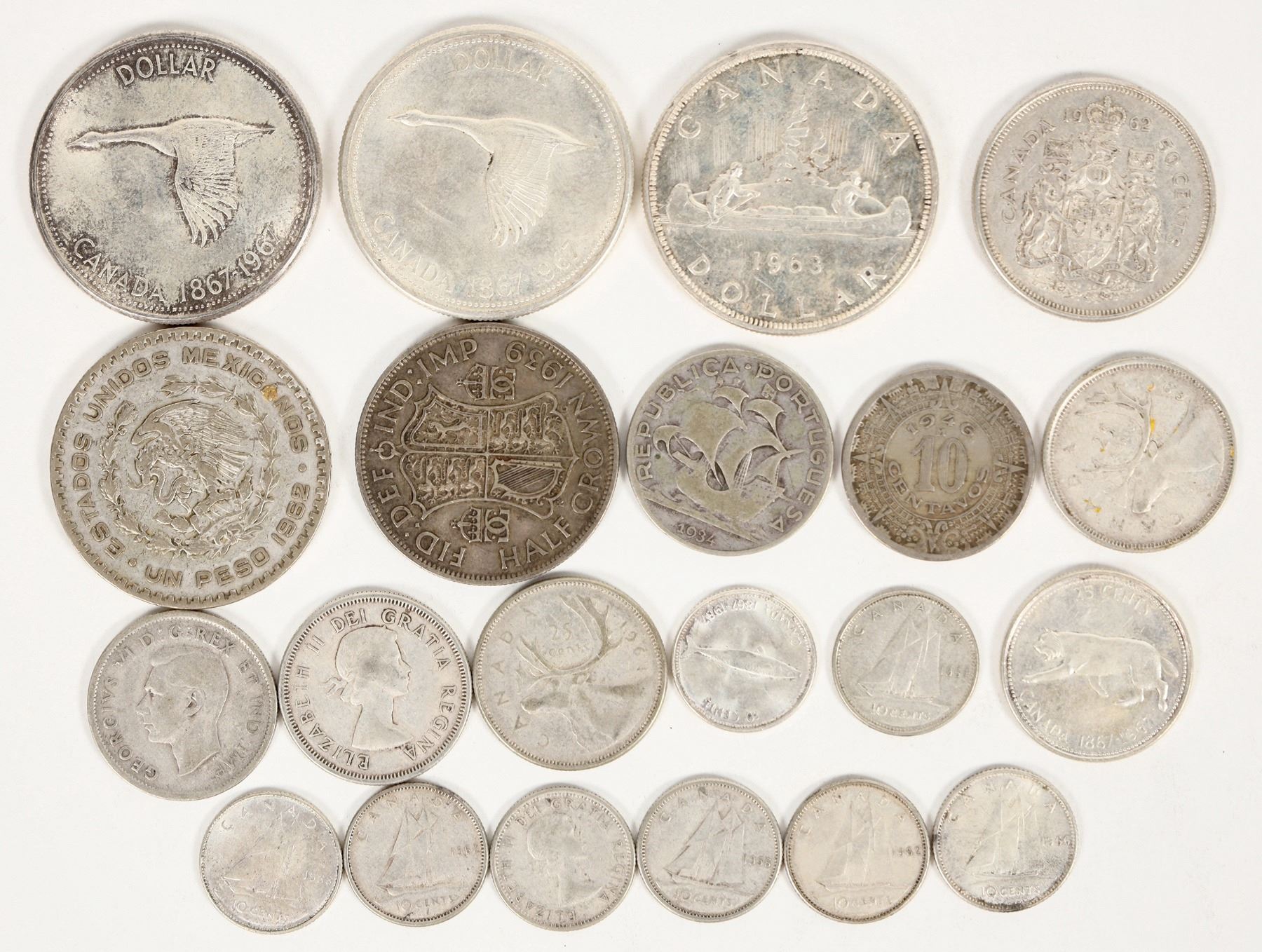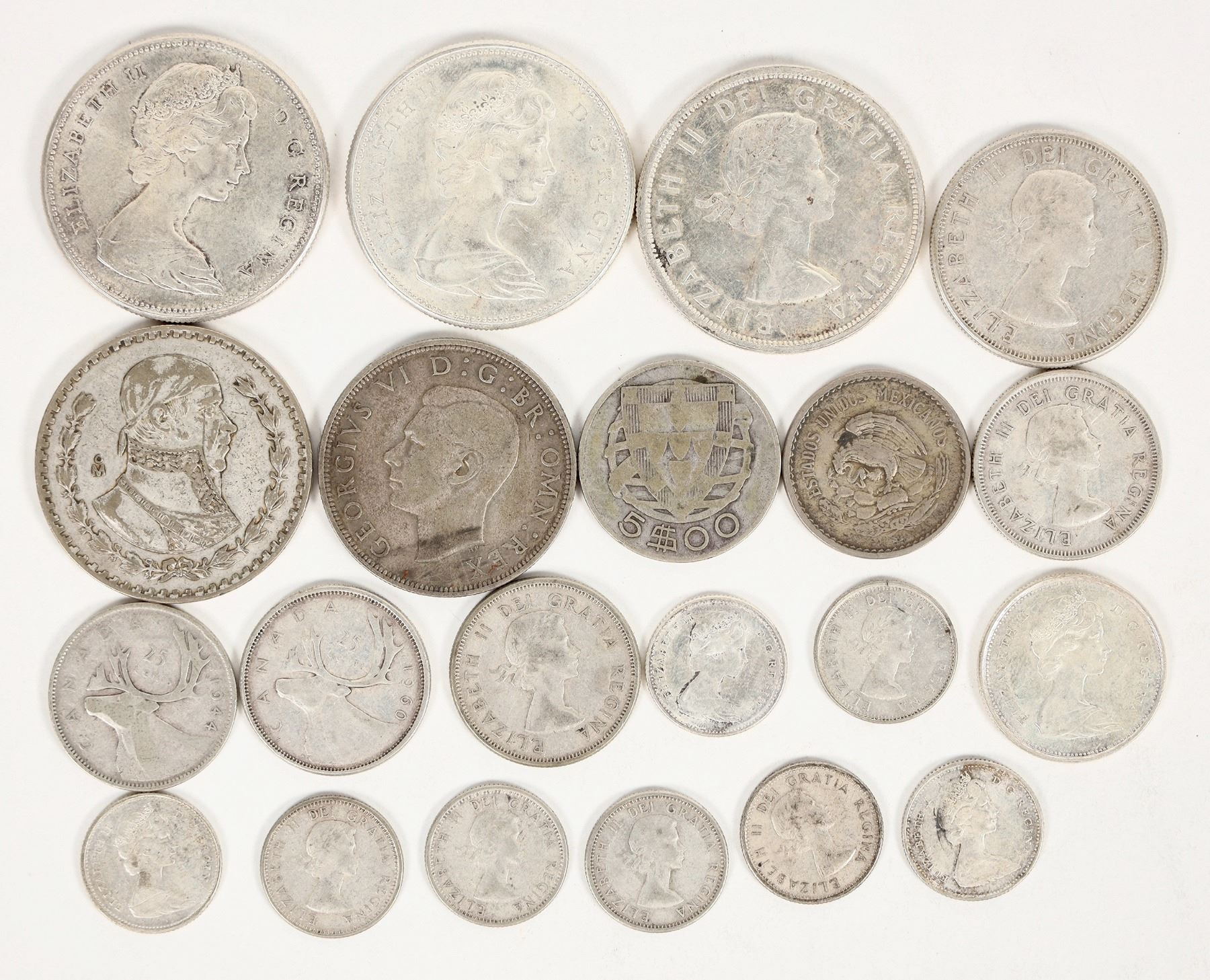 21 foreign silver coins: 1962 Mexican peso; 1939 half crown Great Britain; 1934 Portugal $5; the rest from Canada: 8 dimes; 6 quarters; one half dollar; 3 silver dollars.