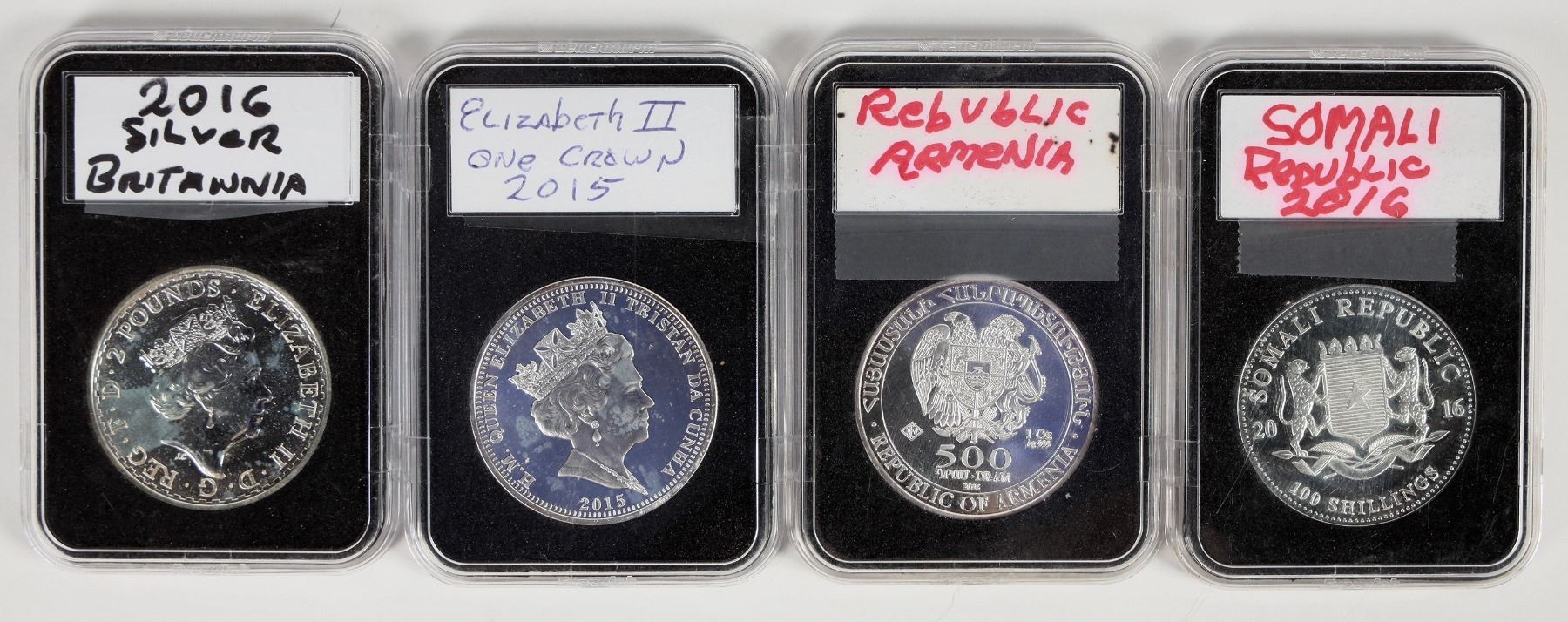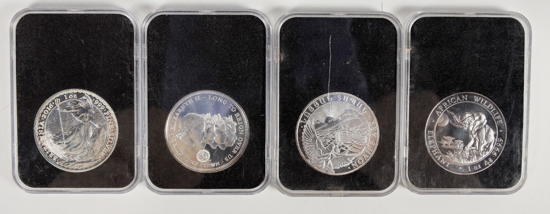 Four one ounce silver coins: 2016 Somali Republic 100 shillings; 2016 Britannia; 2015 one crown Tristan Da Cunha; Republic of Armenia Noah's Ark.
