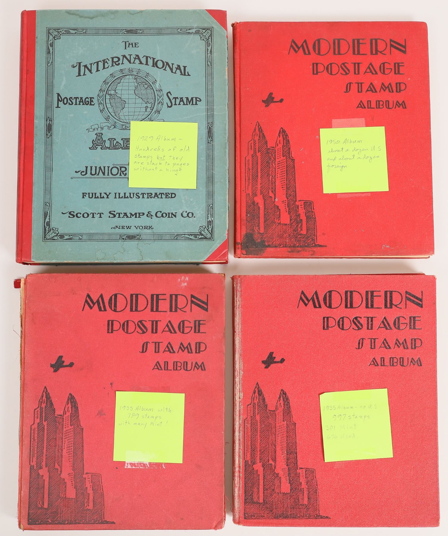 4x 99% foreign stamps albums, c. 1929-50 with 2000+ stamps. Nice starter collection of foreign stamps.