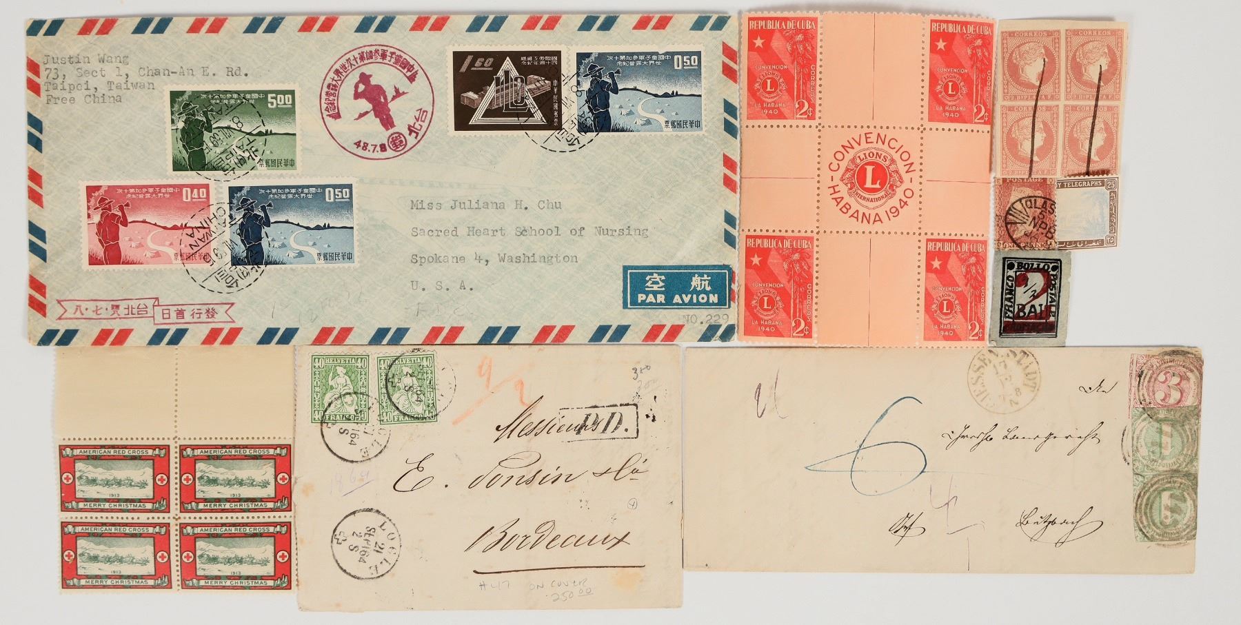 Lot of 10. 1864 cover to Bordeaux; air mail cover sent from Taiwan to Washington;1864 US Sanitary Commission 10 cent; block of 4 Cuba stamps; unknown error stamp; block of 4 American Red Cross Christmas stamps; block of 4 Cuba 2 cent stamps; and more. Please inspect.