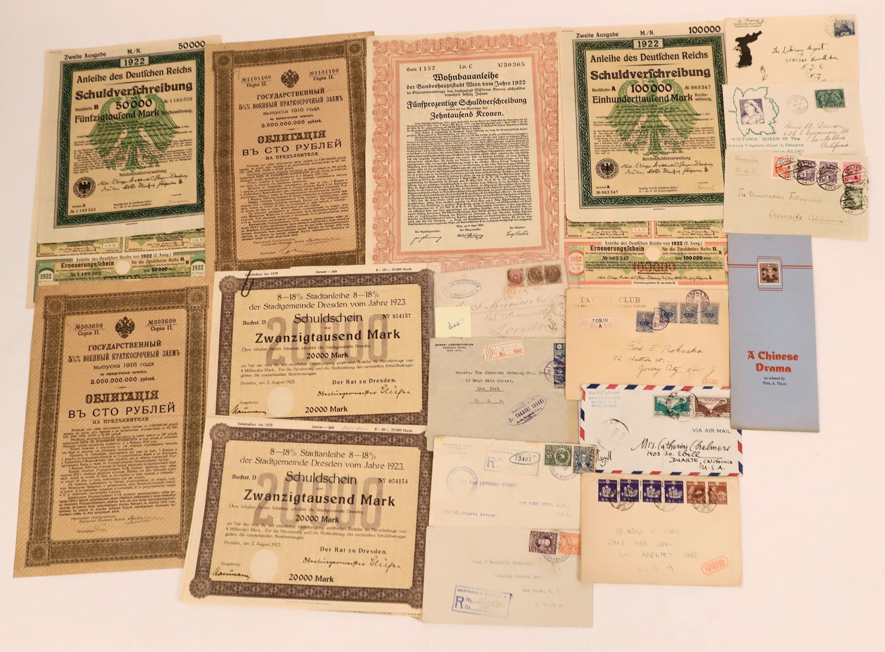 A) Stock certificates from Europe. Includes 1922 German certificates for 50,000 and 100,000 marks, a 1923 German certificate for 20,000 marks, a Vienna building loan from 1922, and a Russia stock certificate from 1916. These certificates are entirely written in the language of their respective country. Various sizes, about 12.5 x 8, all good condition.