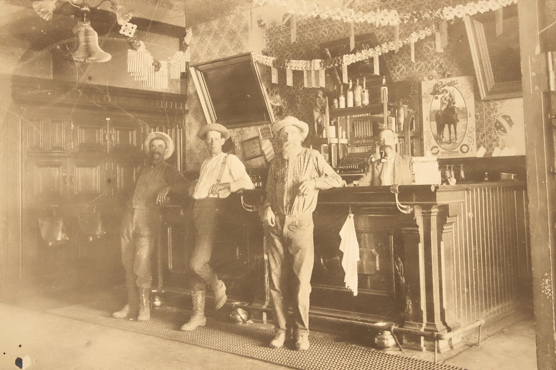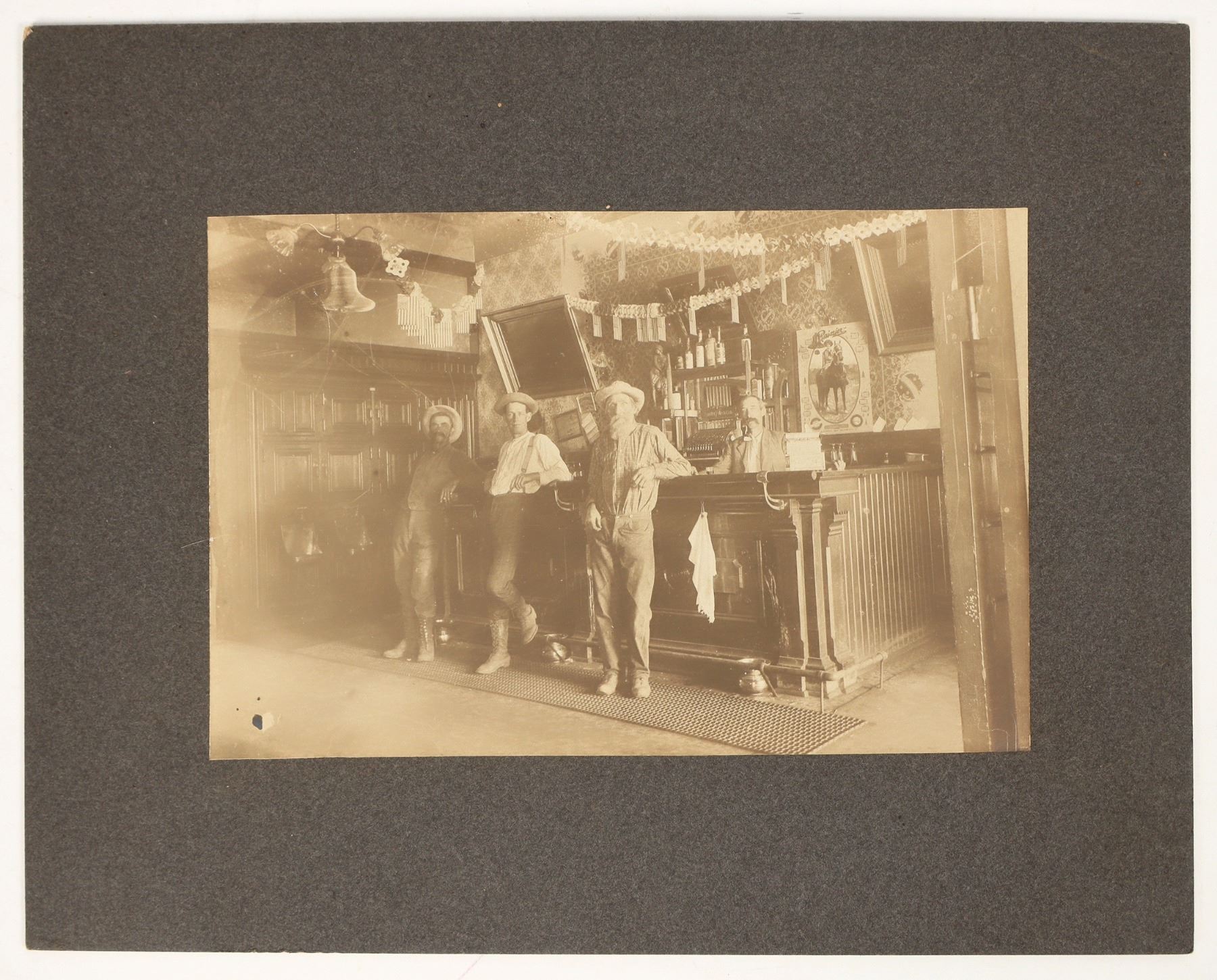 Fantastic! View of an interior of a saloon that is identified on reverse as Forest Hill, California. Three prospectors at the bar with a bartender. Three spittoons on the ground. There is a 1906 Rainier Beer calendar on the wall and a trade stimulator on the counter. Medium contrast, nice detail. 4.5. 7" photo on 8 x 10" mount.