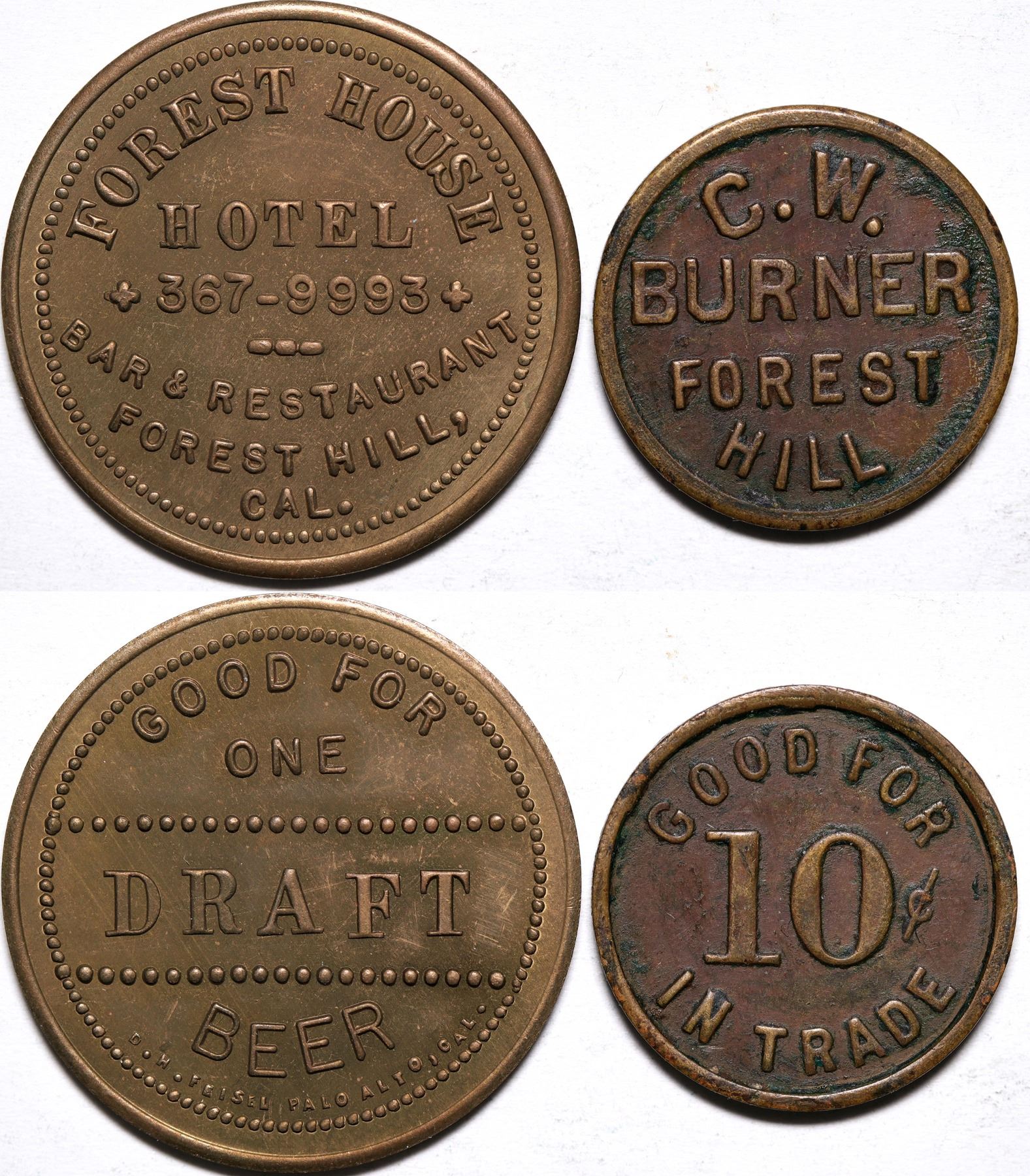 Lot of two from the Placer County town: 1) Forest House / Hotel / 367-9993 / Bar & Restaurant / Forest Hill, / Cal. // Good For / One / Draft / Beer; Br. rd., 28 mm. 2) C. W. Burner / Forest / Hill // Good For / 10c / In Trade; Br., rd., 21 mm.