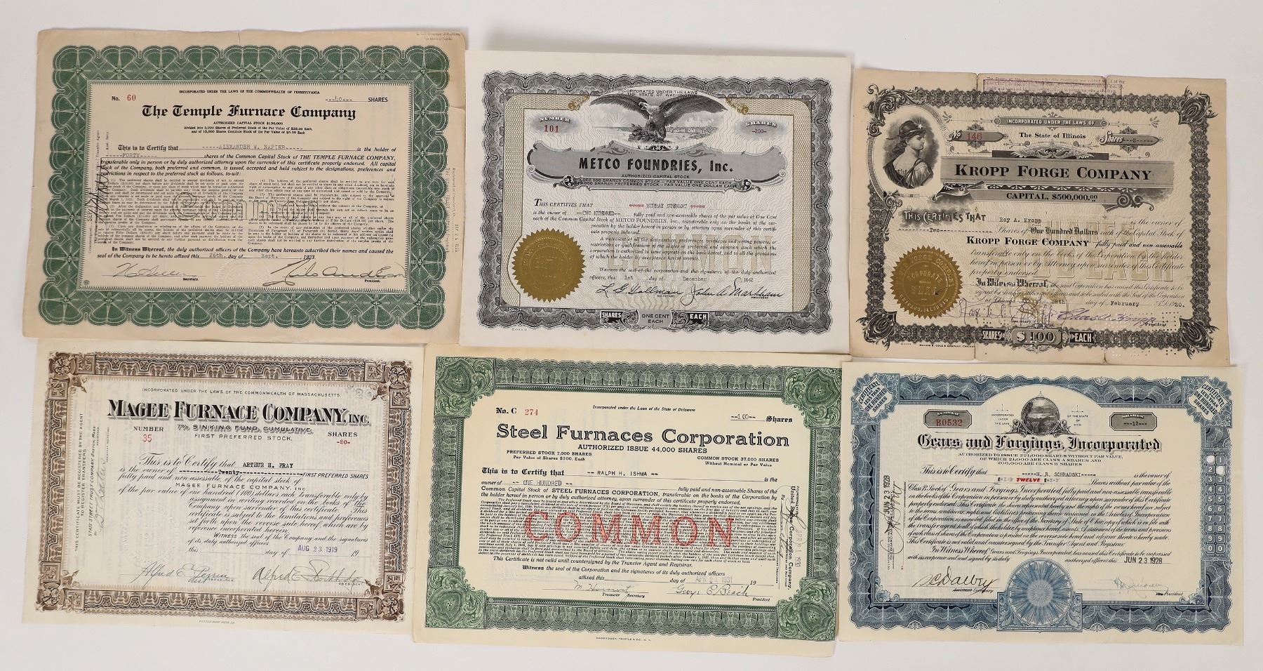 Stock certificates from forge, furnace and foundry companies. Included are certificates from Metco Foundries, Kropp Forge Company, Magee Furnace Company, Gears and Forgings Incorporated, Steel Furnaces Corporation and The Temple Furnace Company. All are in nice condition. Please see photos for more details. 1900s